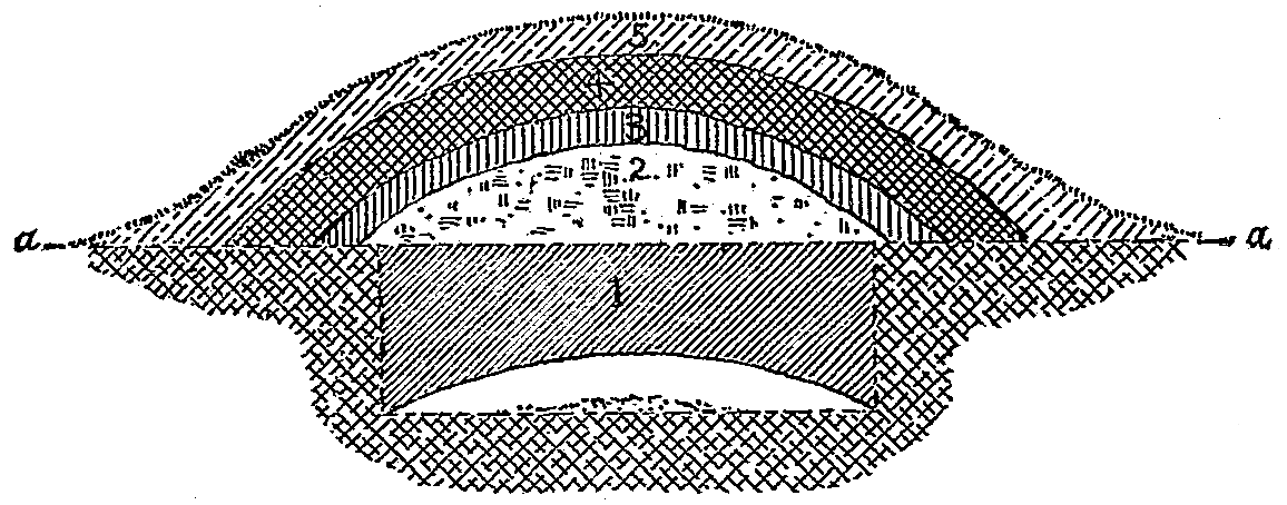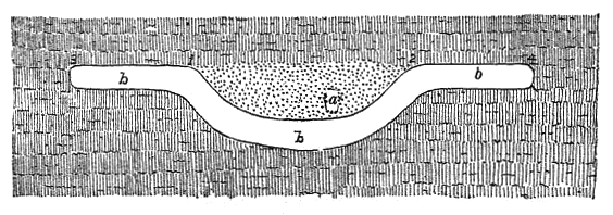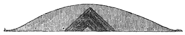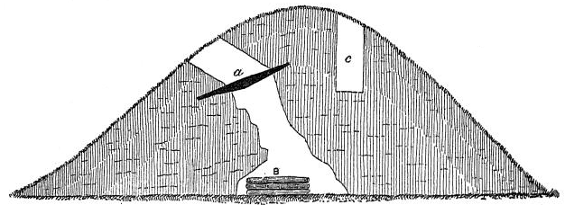 The bottom of this layer corresponded with the original surface of the ground, but the excavation being continued, a circular vault or pit, 6 feet in diameter, was found extending downwards, with perpendicular sides, to the depth of nearly 3 feet. The bottom of this pit was covered to the depth of an inch with fine chocolate-colored dust. Although the filling of this pit was chiefly sand, there was a cavity at the bottom a foot high in the center, over which the sand filling was arched as shown in the figure.[Pg 18]