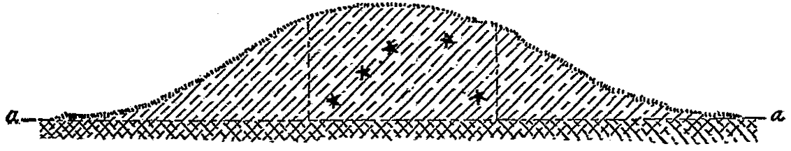 A large portion of these mounds, as has already been stated, are unstratified, and each was probably thrown up and completed at one time; yet skeletons are found at various depths in some of these, as, for example, one opened by Mr. Middleton, in Vernon County, a vertical section of which is shown in Fig. 6, a a indicating the original surface of the ground and the stars the positions of the skeletons, some of which were stretched out at full length while others were folded. The heads were towards different points of the compass and the bones of all were so much decayed that none could be preserved. Several instances of this kind were observed, in some cases those skeletons near the surface or top of the mound indicating burial after contact with the whites.