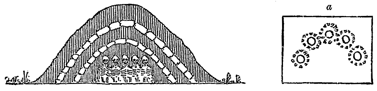 We excavated fourteen of the mounds, some with the greatest possible care. They are all sepulchral, of a uniform construction as represented in Fig. 1 [our Fig. 1.] Most of them contained more than one skeleton; in one instance we found no less than seven. We could detect no appearance of stratification, each mound having been built at one time and not by successive additions. During the investigations we obtained sufficient evidence to warrant me in the following conclusions. The bodies were regularly buried in a sitting or partly kneeling posture facing the east, with the legs placed under them. They were covered with a bark or log roofing over which the mound was built.[4]