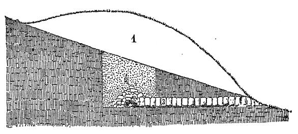 Proceeding from the top downwards, there was first a layer of soil and sand about 1 foot thick; next, nearly 2 feet in depth of calcined human bones, without order, mingled with which were charcoal, ashes, and a reddish-brown mortar-like substance, burned as hard as pavement brick. This layer is numbered 4 in the annexed cut (Fig. 4), which represents a vertical section of the mound. Immediately below this was a layer about 1 foot thick (No. 3) of clay or mortar mixed with sand, burned to a brick-red color. Below this, in the space marked 2 in the cut, were found the bones of fifteen or twenty individuals, in a confused heap, without order or arrangement. Mingled with these were firebrands, charcoal, and ashes. The bones were charred, some of them to charcoal, and some were glazed with melted sand. The mass appears to have been first covered with soft clay-mortar, which ran into and filled the spaces, and the burning to have been done afterwards by means of brush or wood heaped on the top, as among the bones were lumps of hard burned clay.