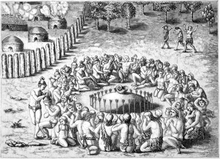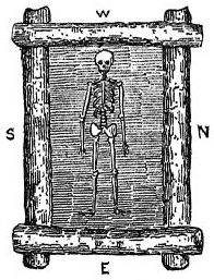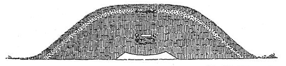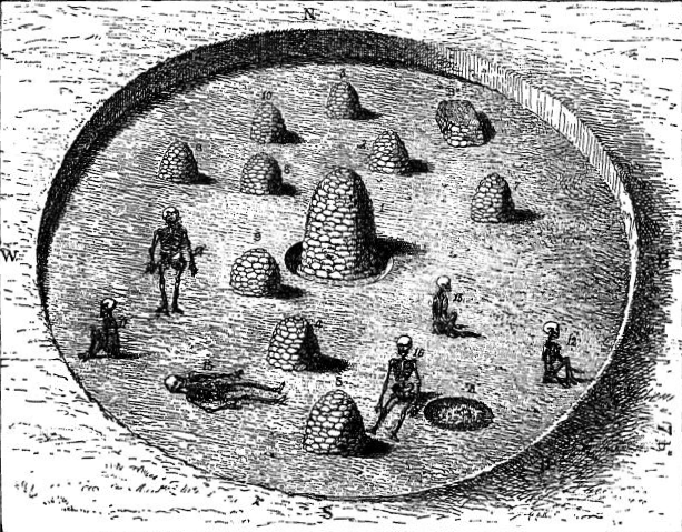 make a large round hole in which the body can be placed upright or upon its haunches: which after the body is placed in it is covered with timber to support the earth which they lay over, and thereby keep the body from being pressed. They then raise the earth in a round hill over it.[11]