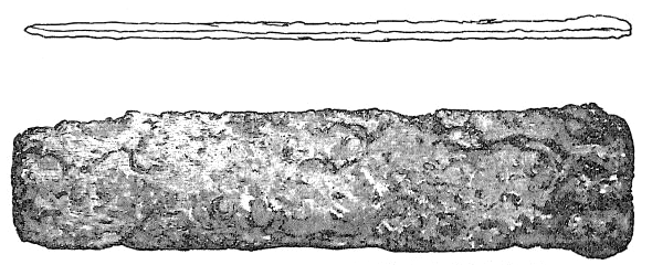 One large mound of this group, 70 feet in diameter and 10 feet high, still unexplored, was opened. It had been considerably defaced, especially on the west side. According to tradition it was a noted burial place with the Indians, which was certainly confirmed by the result.[Pg 19] The surface or top layer was composed of sand and alluvial earth to the depth of some 3 or 4 feet. Scattered through this in almost every part of the mound were human skeletons in various stages of decay and in different positions, but mostly stretched horizontally on the back. Scattered among the remains were numerous fragments of blankets, clothing and human hair, 1 copper kettle of modern pattern, 3 copper bracelets (hammered from native copper), 1 silver locket, 10 silver bracelets (one having the name "Montreal," and another the letters "A B" stamped on it), 2 silver earrings, 6 silver brooches, 1 copper finger-ring, 1 double silver cross, 1 knife-handle, and 1 battered bullet. In fact the top layer to the depth of 3 or 4 feet seemed to be packed as full of skeletons and relics as possible.