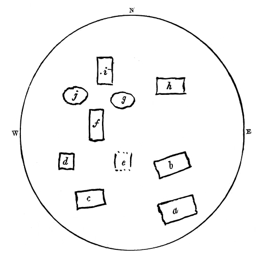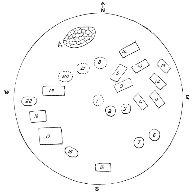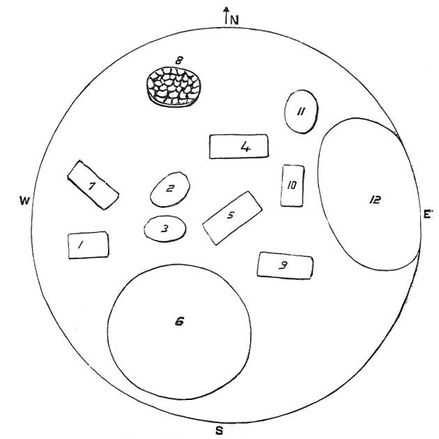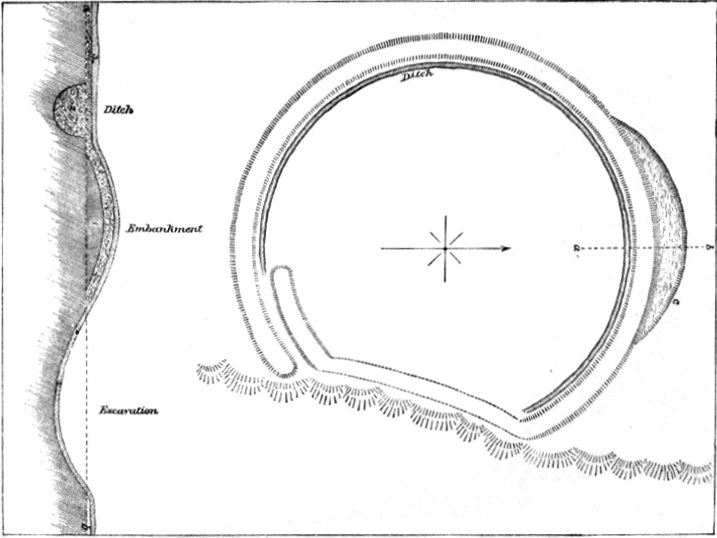 In some instances the mound contained a circular stone wall, within which a pit had been dug to the depth of 2 or 3 feet in the original soil, as, for example, the one near Waukesha, described by Dr. Lapham.[7]