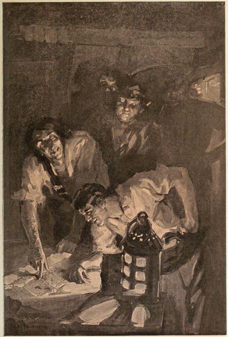 I had been thinking hard and I had come to the conclusion that our only safety lay in keeping the three members of the crew securely locked[348] up. If I could have depended upon one of them the problem would have been simplified immensely, and if I could have depended upon two we could have got along with some degree of comfort, for the three of us with the aid of tackles could have handled the ship while my lady steered. But it was not to be thought of.