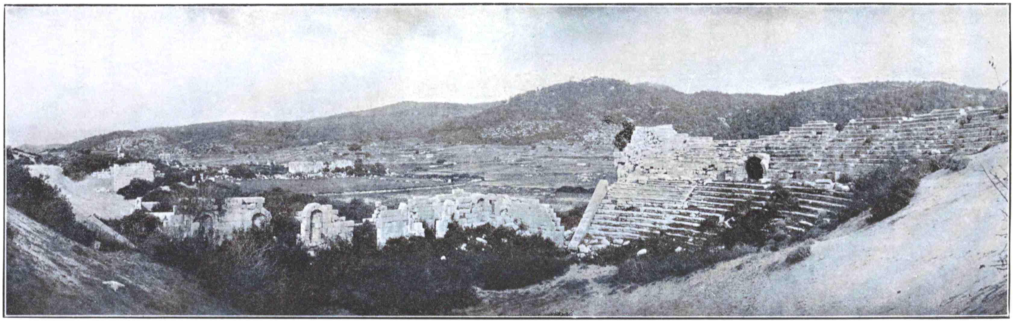 At Phaselis we saw the last of Lycia, except her higher snows, which open out, peak behind peak, in the backward view from the northern shore of the Gulf; and we passed on to Pamphylia, the land of All Tribes in antiquity and still a home for the scrapings and leavings of peoples. Whenever the Ottoman Government wants116 place for refugees, it plants them in Pamphylia. Thither have come Moslems from Greece during the war of independence, and Moslems from Crete since the Liberation; Circassians and Bulgars, at any time during the past generation; and gypsies at all times since the Ottoman conquest. All alike live as though halting for no more than the day, and waiting the word to go farther and fare better—or worse. There are very few villages, and those that exist seem not of the country. Even as progress is reckoned in Asiatic Turkey, Pamphylia is an unprogressive land, where no one appears to think it worth his while to do more than mark time. Why residence there should be so little desired, I know not. Perhaps it is undesirable. With their southward aspect, and great mountain screen to the north, the coastal plains must be intensely hot in the summer months; and since they are largely alluvial and in many parts marshy, mosquitoes and fever are probably all too rife. But just because it is so desolate now, Pamphylia keeps the most wonderful memorials of her past. Termessus and Perga, Aspendus and Sidé were not very great or famous cities in their day, and were it not for Paul the Apostle, had hardly been known by name to the modern world at large. But their remote ruins have survived as have hardly any others of their epoch, and all are famous cities now.