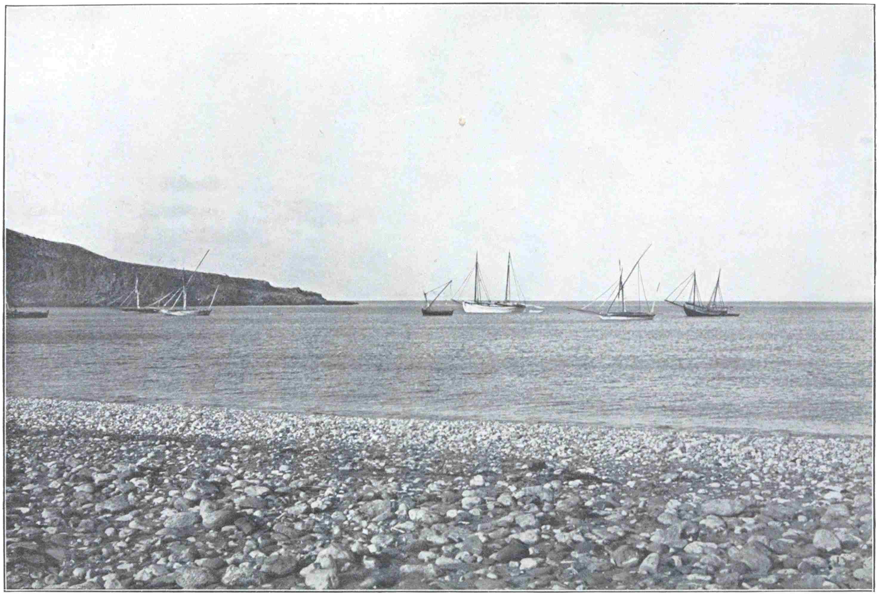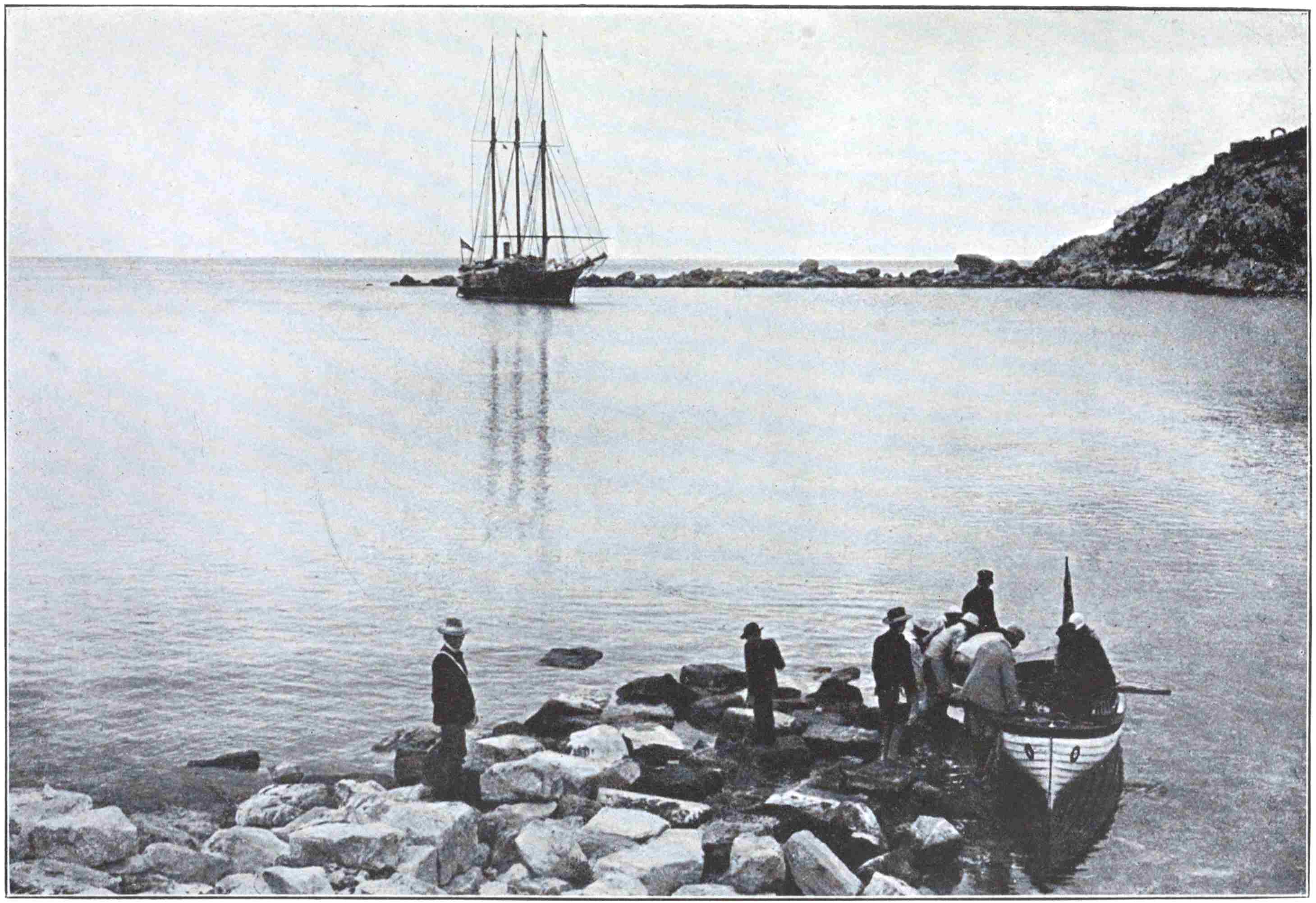 On the cliffs of Ras Hilal we bade good-bye to the clean-living fellows who had escorted us and quietly refused our rewards. Gladly would the Owner have done them the honours of his ship, but this their old captain would not allow. In the latter’s debt, too, we remained; for after he had been got aboard the swinging, pitching yacht at risk of a broken leg or a141 cracked skull, he pleaded to be let go again at once, and was put with difficulty back on shore. The western current which sweeps this iron-bound coast, was holding the ship broadside to the seas, and with wind and wave coming hour by hour more directly from the north, the open bay of Marsa Hilal was no place to ride in longer. Steam was got up, a course was set for Sicily, and by sunset the mountain of Cyrene lay on the horizon like a low cloud.
