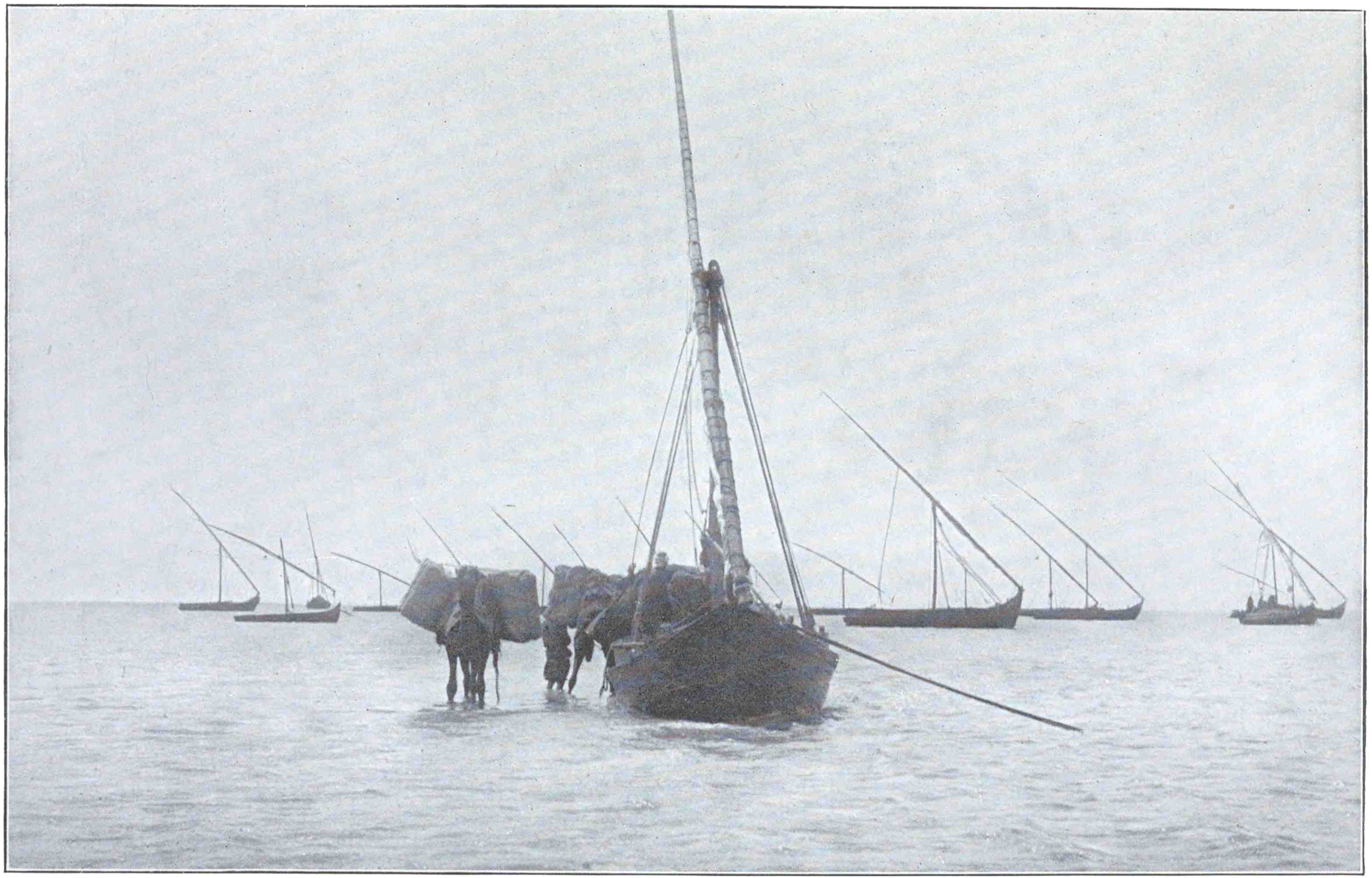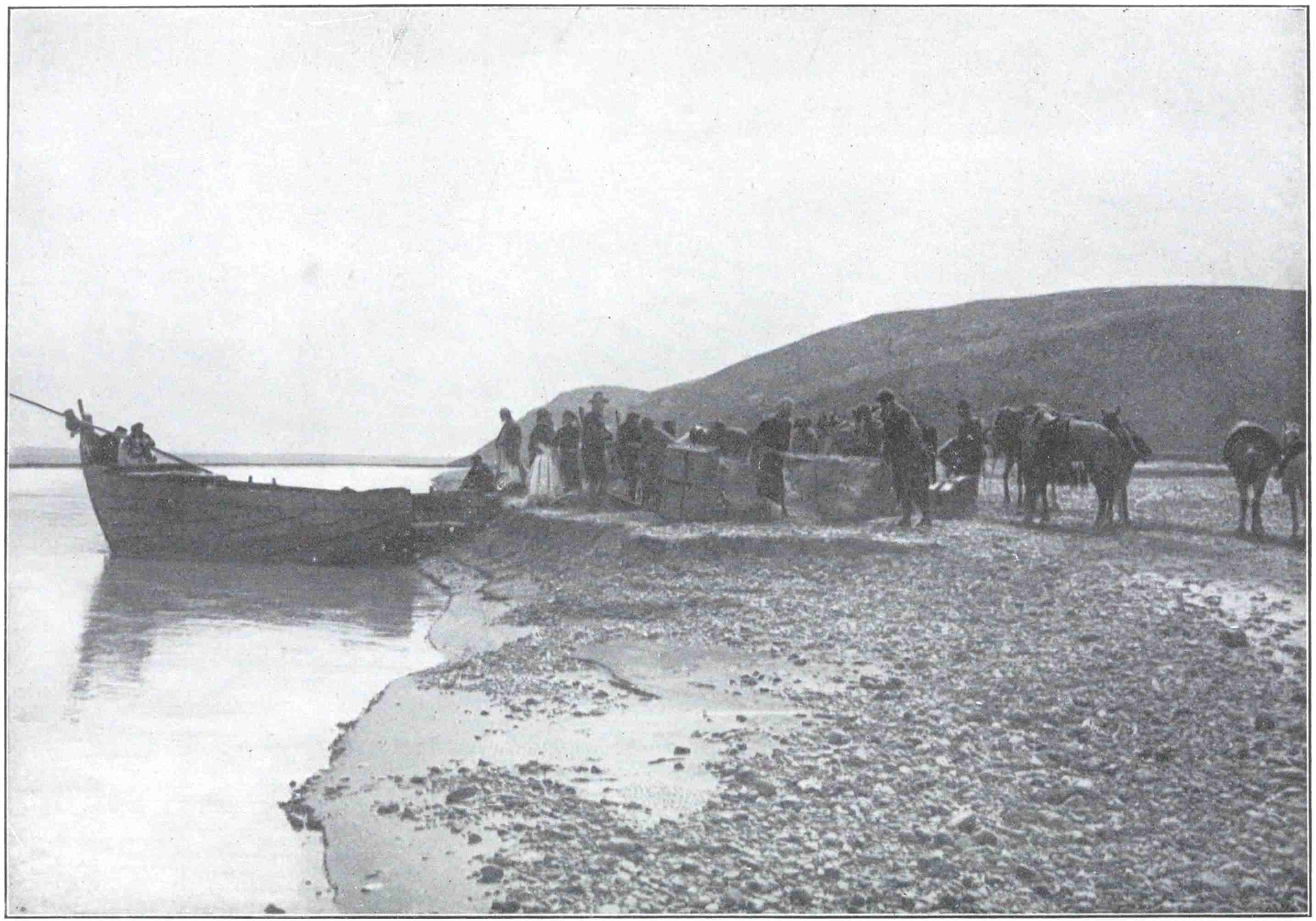 At last we descried twin high-pooped arks crawling upstream under the farther bank, each towed by a dozen straining men. In an hour they would cast off, and by grace of bare poles, unwieldy rudders, currents and eddies, cunningly used, hit our point on the shore or miss it by a hundred yards, by a quarter of a mile, by more or by less, as Allah should will. Eight times I have crossed Euphrates in flood, and eight times failed to see earthly cause why the ferry-boat should ever attain the farther shore. Once cast off, I have lost all sense of headway, and seemed to slide down a boiling race, which had the boat at its mercy, keeping pace at its sides; and thus I have drifted into mid-stream. Then173 suddenly there is great shouting and working of the huge tiller to and fro, and behold the shore itself, rushing to the rescue, crashes on the keel and the boat heels over with a groan. When I find my feet again in the swaying bilge, I perceive, amazed, that I have crossed Euphrates.