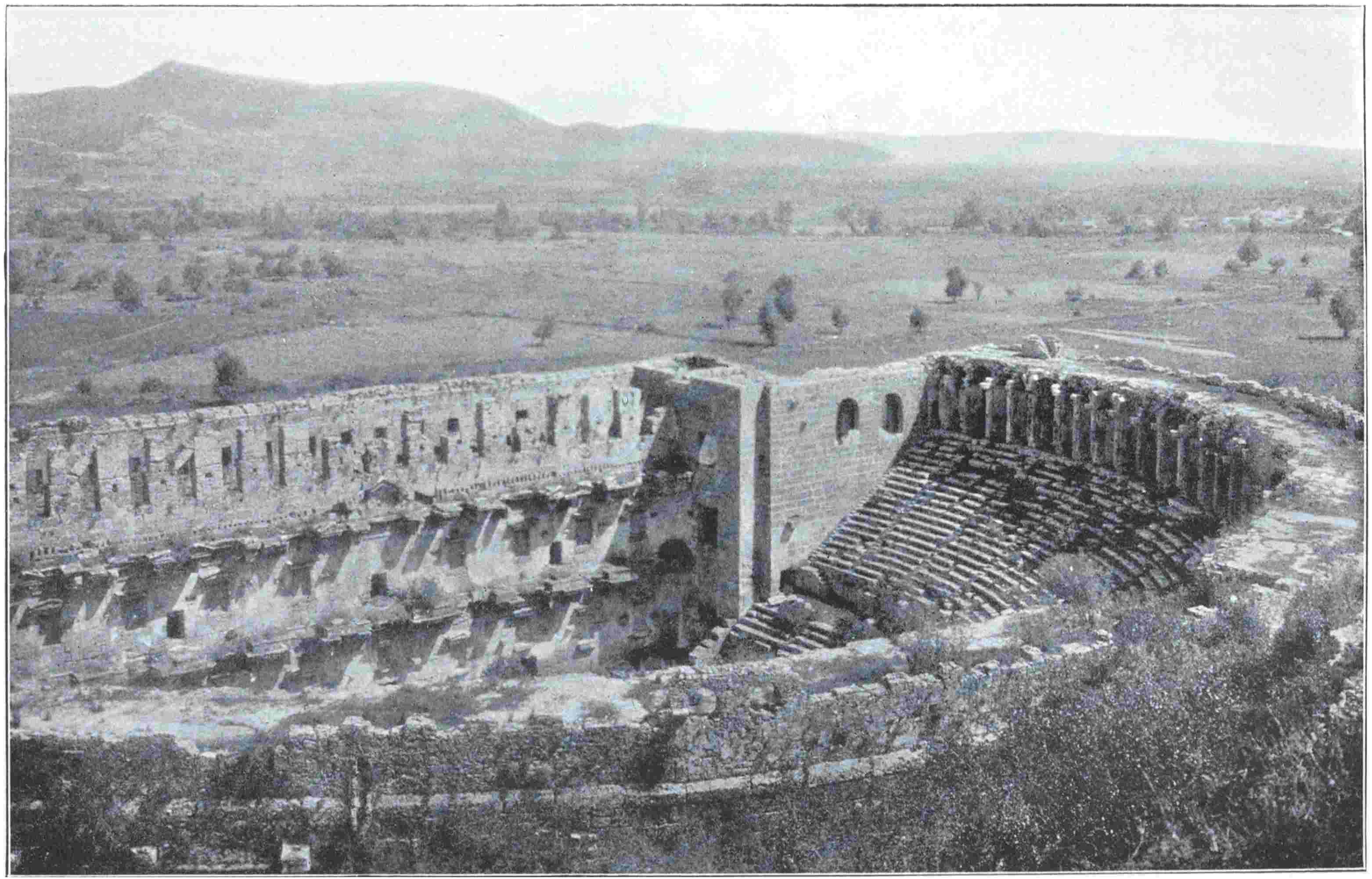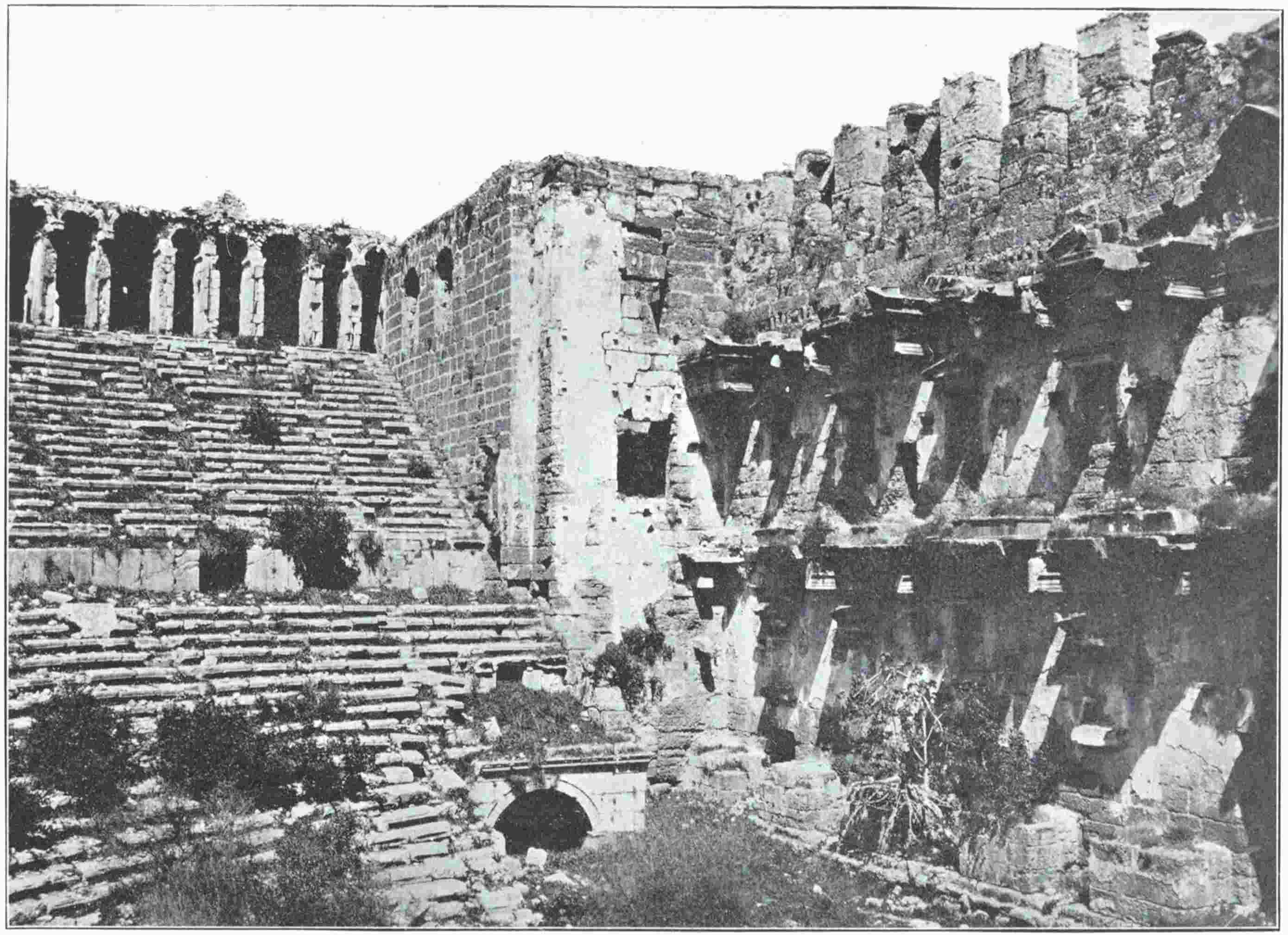 You may have seen amphitheatres in Italy, France, Dalmatia and Africa; temples in Egypt and Greece; palaces in Crete; you may be sated with antiquity, or scornful of it. But you have not seen the Theatre of Aspendus. It has at once the grandeur of scale which excites fancy, and that perfection in survival which, lulling the sense of strangeness, allows fancy to leap unastonished across119 the centuries. In every other Roman theatre, which I have seen, some part of the cavea is perished, the uppermost tiers at any rate being merged so irregularly into the hillside that one may hardly know where seats end and naked rock begins; or else jungle intrudes on the auditorium, and the scena wall, even if so perfect as at Orange, stands a dreary skeleton, with not only its marble statues lost, but all marble mouldings and casing whatsoever. Thus, whether one look up or down, all illusion that the building might still serve its first purpose, is cheated. But at Aspendus, not only is every bench in its place and perfect, but the cavea is still crowned with the original arcade which served as a finish and coping to the whole. Vegetation has hardly been able to take root in the close joints of the masonry, and the ancient drains and gutters, which are still serviceable, have suffered little silt to settle in the orchestra. From the stage buildings little is missing, and from the scena wall nothing, except the contents of the niches. All stones are still square and sharp, and the courses are true as if laid yesterday. The whole building, moreover, is of gigantic size, erected not at divers epochs by the city, but all at once by the pious munificence of one wealthy individual, desirous to outdo all other citizens of the Empire in gratitude for the victorious return of Lucius Verus from the East; and under the inscription by which this his act is recorded for all time to come, one enters the main portal to right of the stage. A taciturn officer of the Adalia police, who had ridden up with us, stood stock still a moment under this great doorway, and then went off by himself, looking curiously at every part of the corridors, stage and seats. At last he came back, accepted a cigarette,120 and stared slowly round the great horseshoe. “What sort of men,” he asked, “were here before us? No Osmanli built this.”