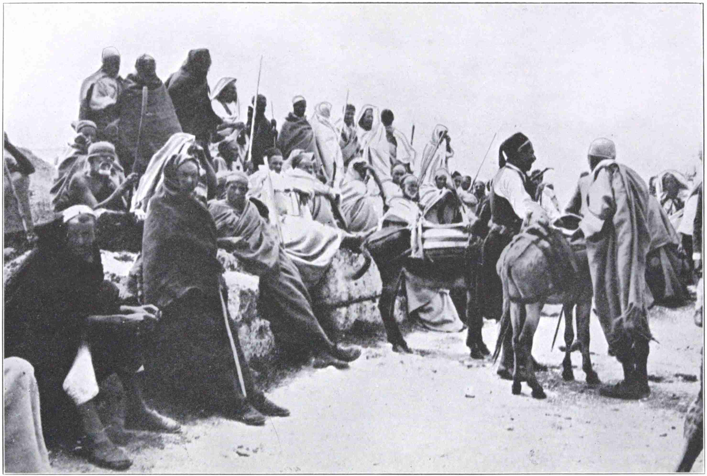 The local saints held themselves aloof, but a group of some forty armed Bedawis gathered to see us go. Squatting, eagle-beaked and narrow-eyed, like so many vultures on a rocky ledge, they set us thinking whether136 they could have found a use for their long guns and spears in some gully of the downward road, had we given them a little longer time for thought. As it was, we felt no fear, and gave back their stare. The Beni Haasa must be very pure Arab. I have noticed no finer type, even among the Bedawis who have come from Nejd itself within short historic memory. A few of their gipsy-like wives, seen not then but next day in the plain of Apollonia, showed the same high breeding in their unveiled faces.