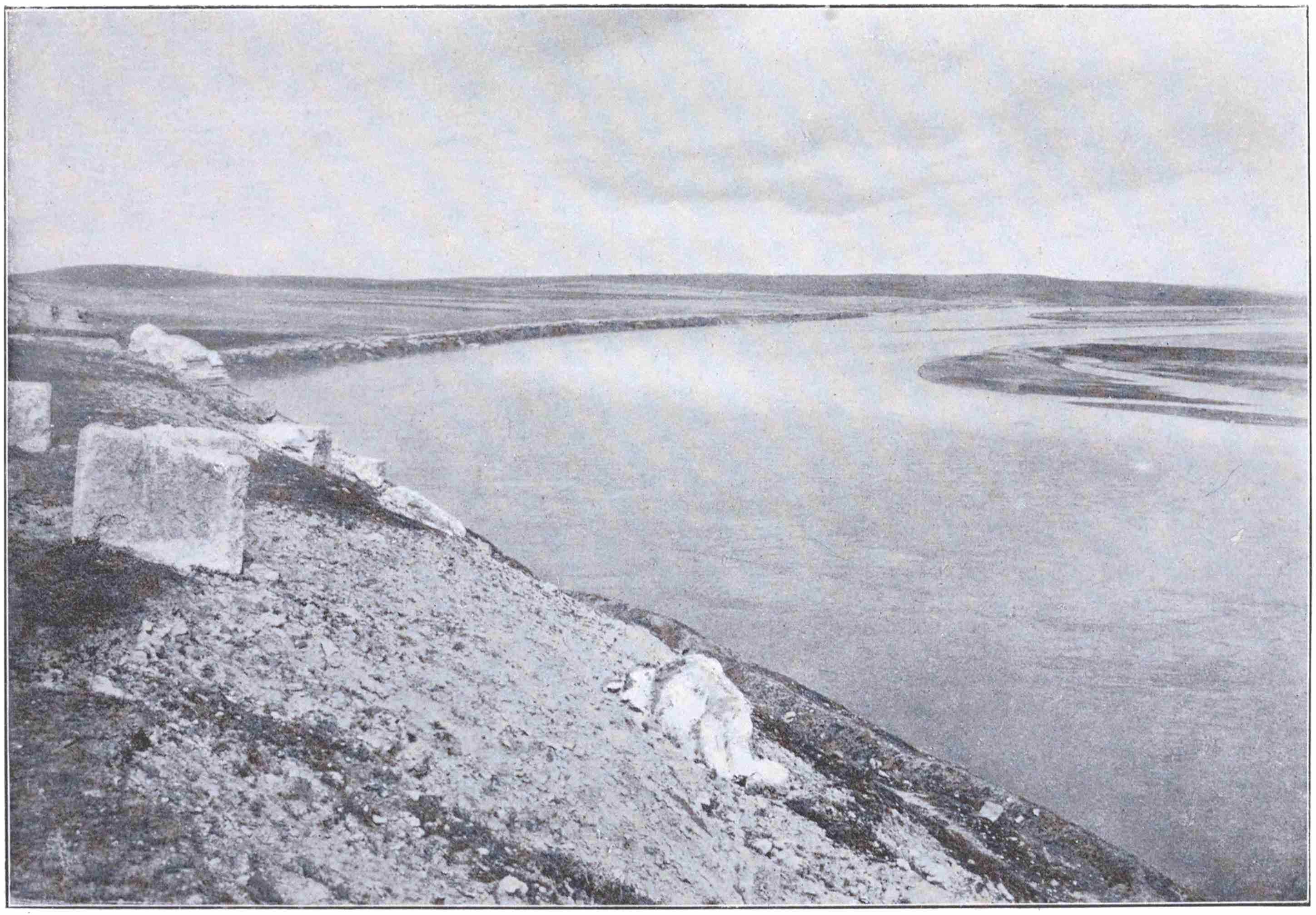 We tramped a mile up stream, and were poled across Euphrates again under the sunset, prize-winners in the lottery of antiquarian discovery. For we had lighted on no mean city, forgotten by Euphrates. Though passed seventy years ago by the British navigators of the river, it had been visited by no western scholar till our lucky star led us down the Sajur. What city it was and how named, its own cuneiform inscriptions do not say. Was it that Til Barsip, chief stronghold of “Ahuni, son of Adini,” which Shalmaneser renamed Kar-Shalman-asharid, and made a royal residence for himself? Or, if this be placed rightly by scholars at Birejik, was one of Ahuni’s lesser cities built at Tell Ahmar? This much is sure—that in Shalmaneser’s day there was a city of Mesopotamia, facing the Sajur mouth, larger in area than Carchemish, where both the Hittite and the cuneiform characters were known and used; and that diggers will search there some day for the bilingual text which shall unlock the last secrets of the Hittite script.