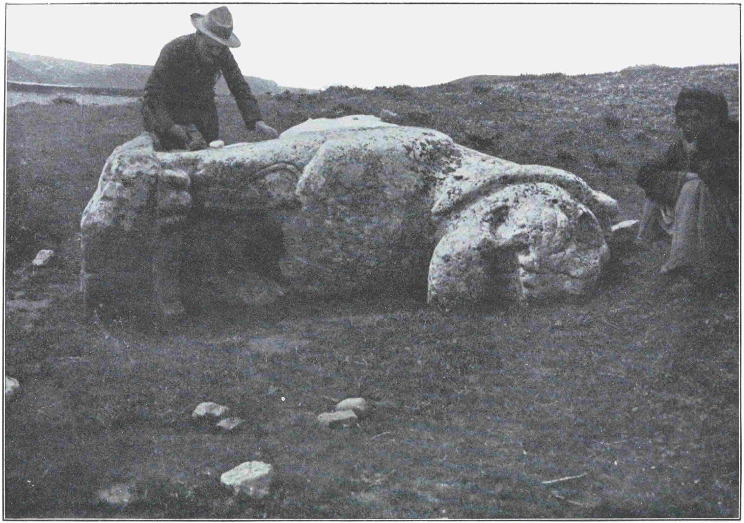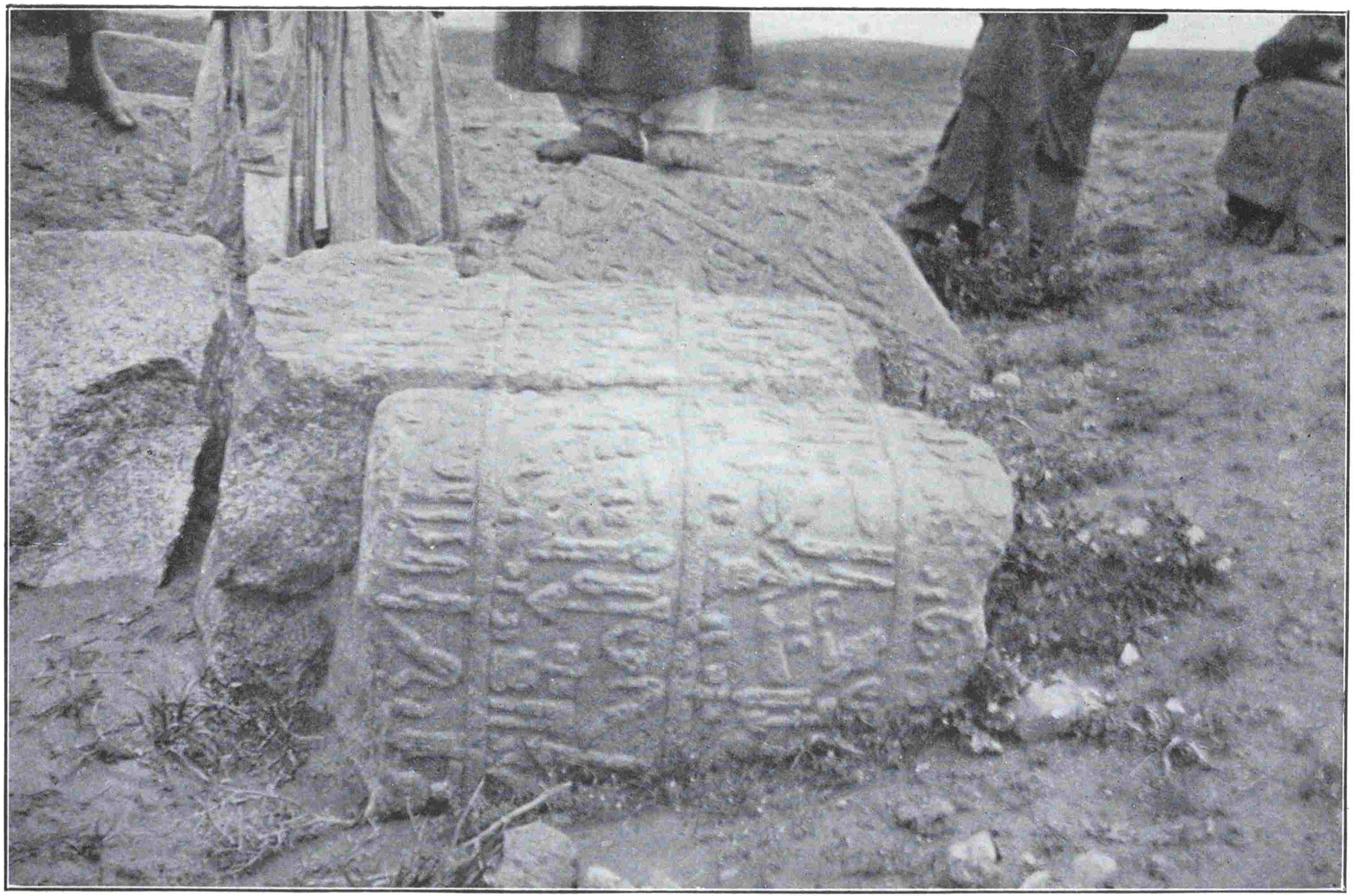 The men led us back by the corner of the hamlet, and stopped near the river bank at a heavy block, on whose upturned face were carved two winged horses supporting the sacred palm-tree. We did what we could with camera and pencil, and then followed the guides inland across the ancient site towards a conspicuous gap in the northern wall-mounds. Through this, we were told, passed the waggon-track to Urfa, and a group of tumbled stones half seen beyond the gate raised our hopes. Nor were they to be disappointed. There lay two great winged lions of heavy Assyrian style, each inscribed with a long cuneiform text on his inner flank. The one was complete in all his parts but175 broken in two, the other was in one piece, but without his head: when erect, each had stood nearly ten feet high from claw to crest, looking up the road towards Nineveh. Their inscriptions are of Shalmaneser the Second, the Great King of the ninth century B.C. who crossed Euphrates from Til-Barsip to Carchemish and Pitru.