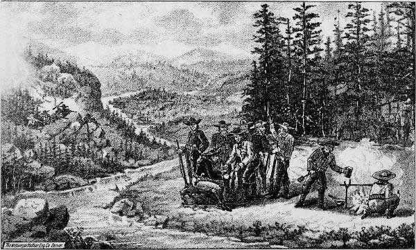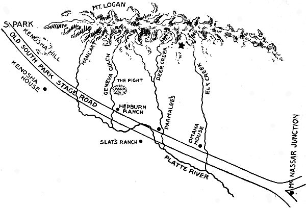 Here they endeavored to obtain pistols, and then bullets and powder and shot, but did not succeed. They did obtain food.[Pg 423] Their course was then straight for the mountains, intending to strike them south of Golden. They reached the foothills about sunrise Sunday morning, about eight miles, as they think, above Platte cañon. They spent most of the day in the mountains, but late in the afternoon came out, went to a ranch about three miles below and obtained feed for the horses and provisions for themselves. They then struck south, and a little before sundown crossed the Platte about a mile below the cañon, intending to strike the southern road. They traveled until about 12 o’clock that night, and after tying their horses laid down on the prairie and slept until morning. They were then on Willow (South Plum) creek, about a mile above Wakeman’s. About 7 o’clock Monday morning they rode to Wakeman’s and got coffee. From there they made south, in a direct line for the foothills, and struck the road running south to Colorado Springs about 3 o’clock in the afternoon. They followed the road for an hour, and then stopped at a house and got supper. They continued along the road, passing Monument and other stations. About 4 o’clock in the morning (Tuesday) they passed through Colorado Springs, and took the road south. Soon they became bewildered, and were uncertain about being on the right road. They descried a ranch and went to a hay-stack and fed their ponies, and discovered the railroad. This assured them, and crossing over to the west side of the track they continued their journey south, crossing the Fountaine about five miles below the ranch, and afterwards crossed back. About twelve miles from Colorado Springs they obtained a dinner and oats for their horses. As they pursued their southerly course, the snow began to fall and impede them. When about one mile from Pueblo, they put up at a ranch for the night, about 10 o’clock in the evening. About 7 o’clock in the morning (Wednesday) they started for Pueblo, and rode down one of the principal streets, when they were discovered. Not until they were close to the bridge did they imagine they were pursued, and then only from the peculiar action of two men on foot and two others on horseback.
