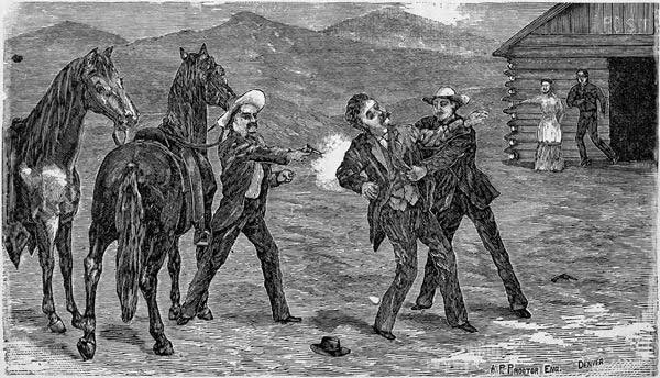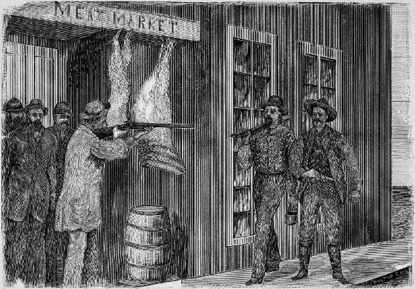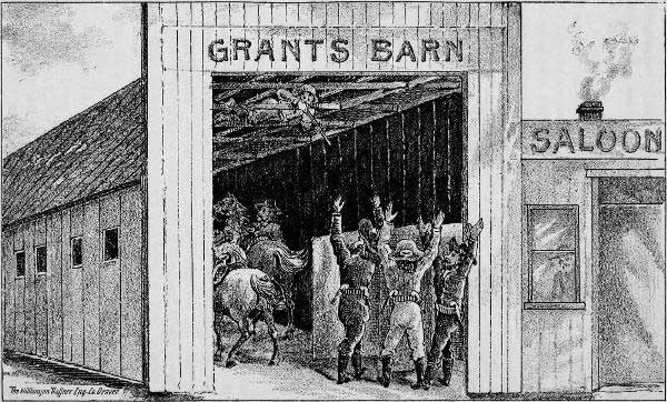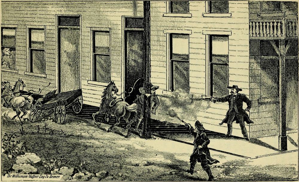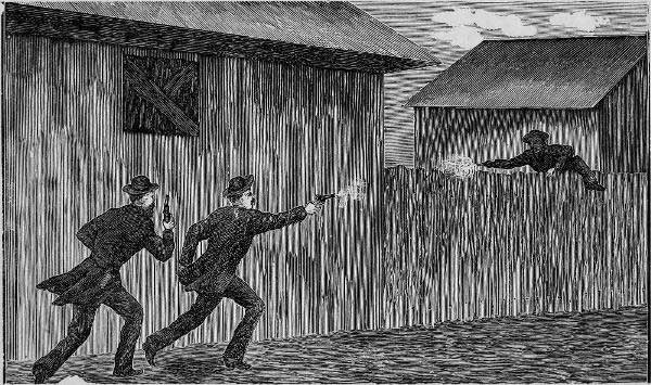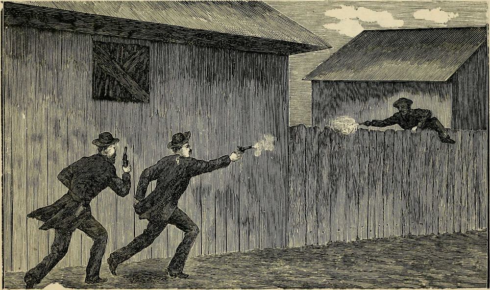 They had proceeded about two hundred yards from the hotel when they heard a shout, and looking back saw one of their guards—Officer Bilby—on the hotel steps, waving his hat. The officers glanced over the town and saw the two men they sought riding through. Instantly they let their horses out, and endeavored to cut off their exit across the bridge. In this they were not successful. Then both rode up behind a building and then into the street, down which the men were riding, about a hundred yards behind them. The men had discovered they were being pursued, and had thrown away their blankets, drawn their revolvers, and put spurs to their horses.