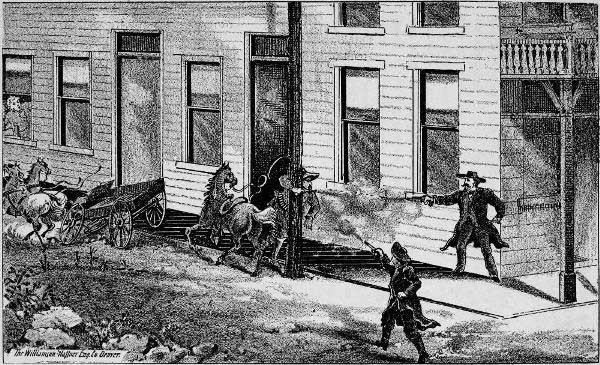 As Cook and Smith rode into the street, Cook called upon the men to halt, but the demand was not heeded.