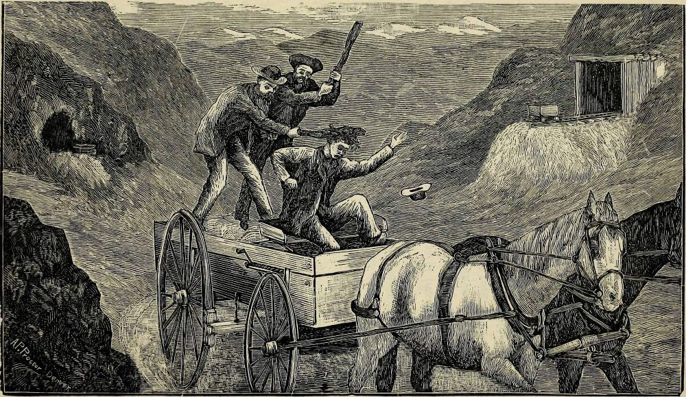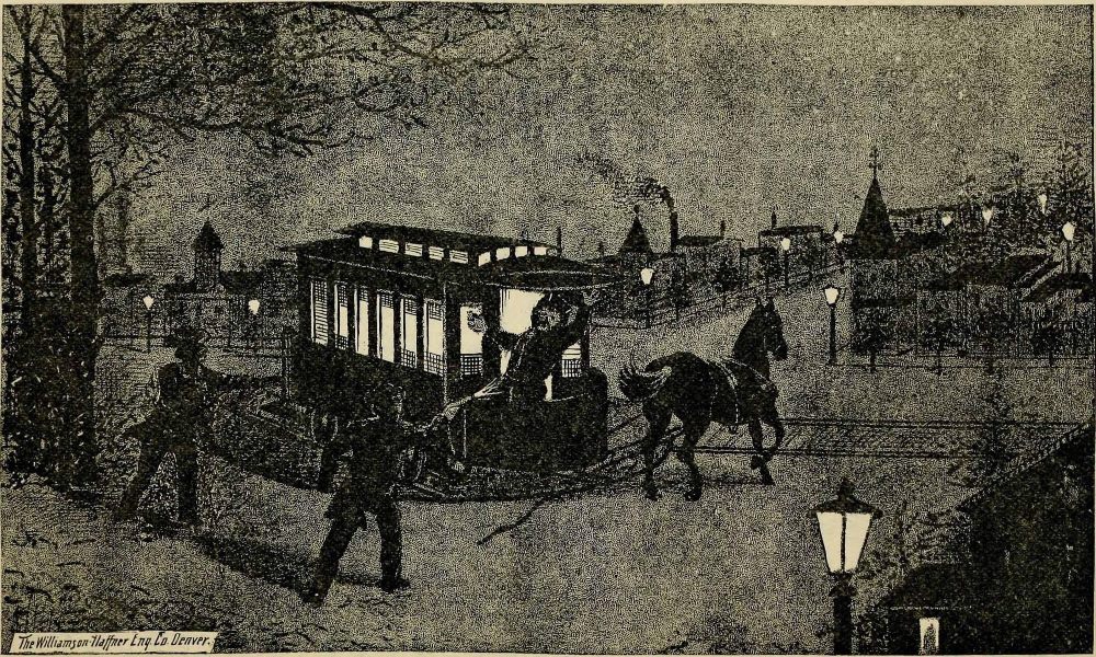 As soon as the train arrived at the depot the prisoners were transferred to a ’bus, their persons being protected by a sufficient number of good men to overawe any crowd who did not care to receive cold lead. The ’bus was occupied by two travelers, Gen. Cook and Frank Smith, of the Rocky Mountain Detective Association, by Johnson and Clodfelter, and Sheriff Ellis, of Pueblo county. On top of the ’bus rode Sheriff Willoughby[Pg 425] and aides. In the rear was a mounted policeman. As the ’bus moved up the street it was surrounded by a number of wagons and carriages, filled with people anxious to get a sight at the noted criminals, while still others followed on horseback.