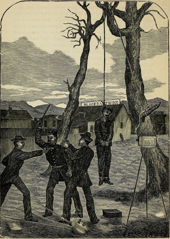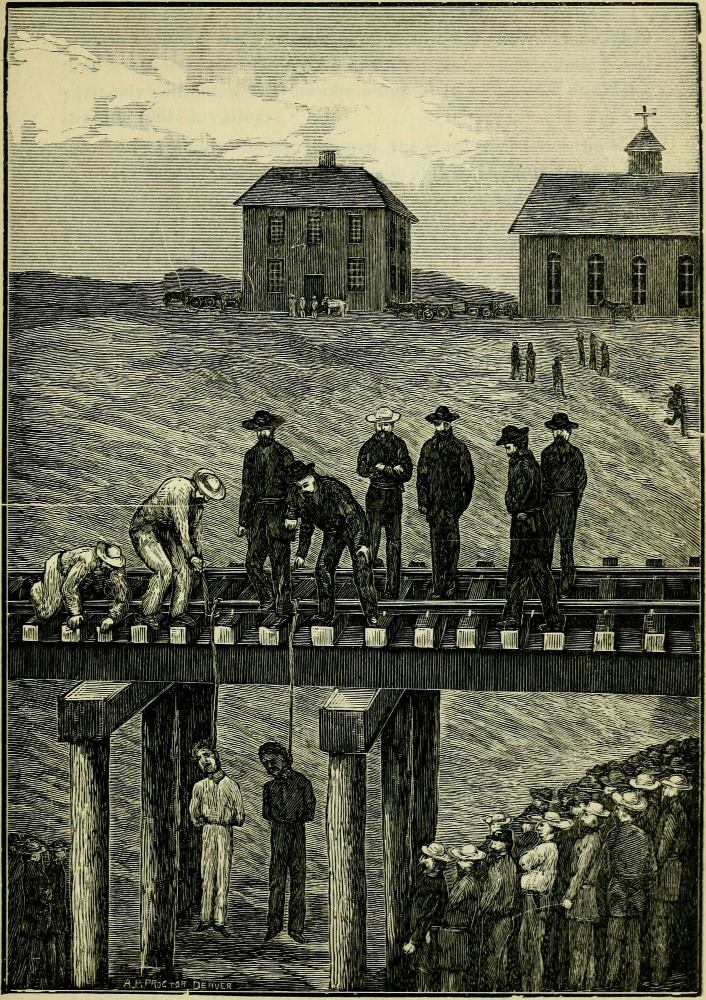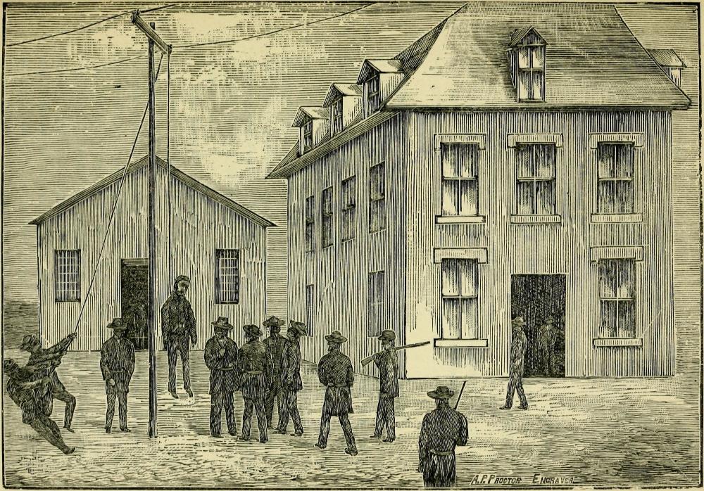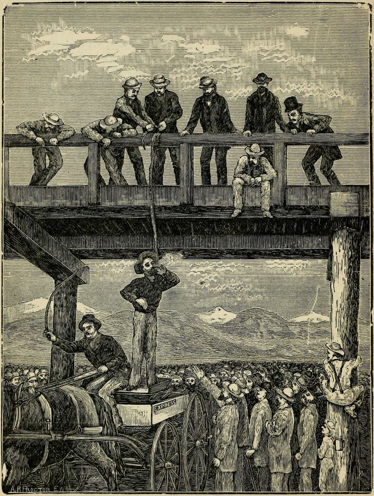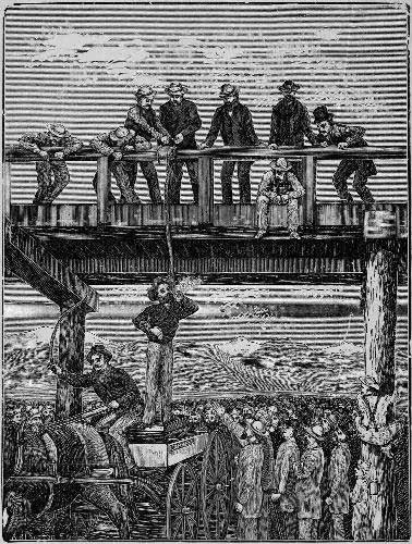 About the time of the arrival of the train, men and boys could be seen wending their way towards the Larimer and Fifteenth street crossings, and also to the depot, as rumor had named each place for the transfer of the prisoners to carriages. The largest crowd collected at the depot, where the train did unload its burden. It is said that there were those in the crowd who openly carried ropes for halters.