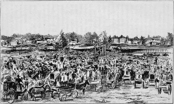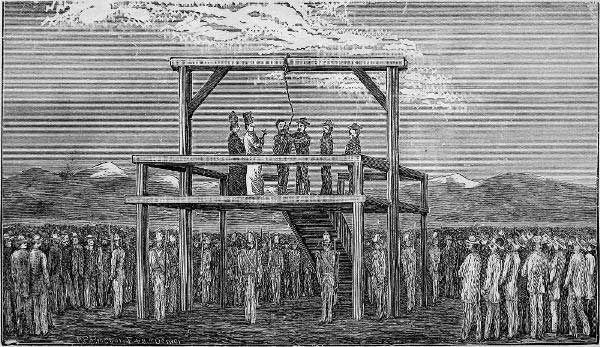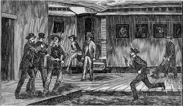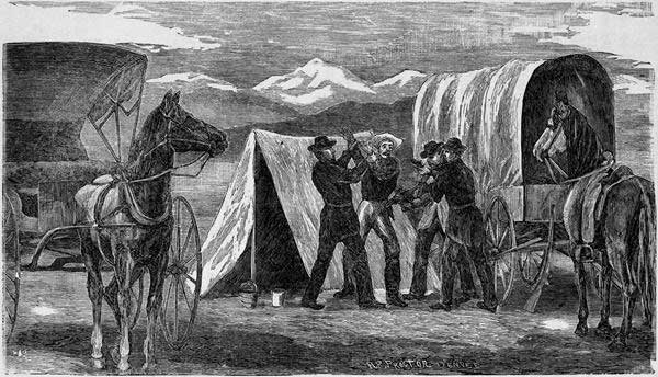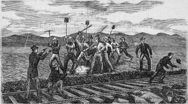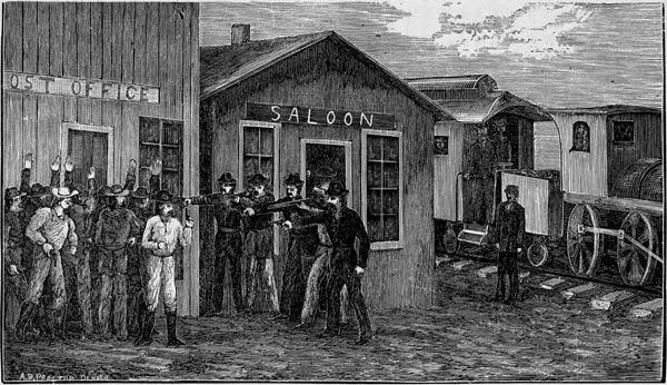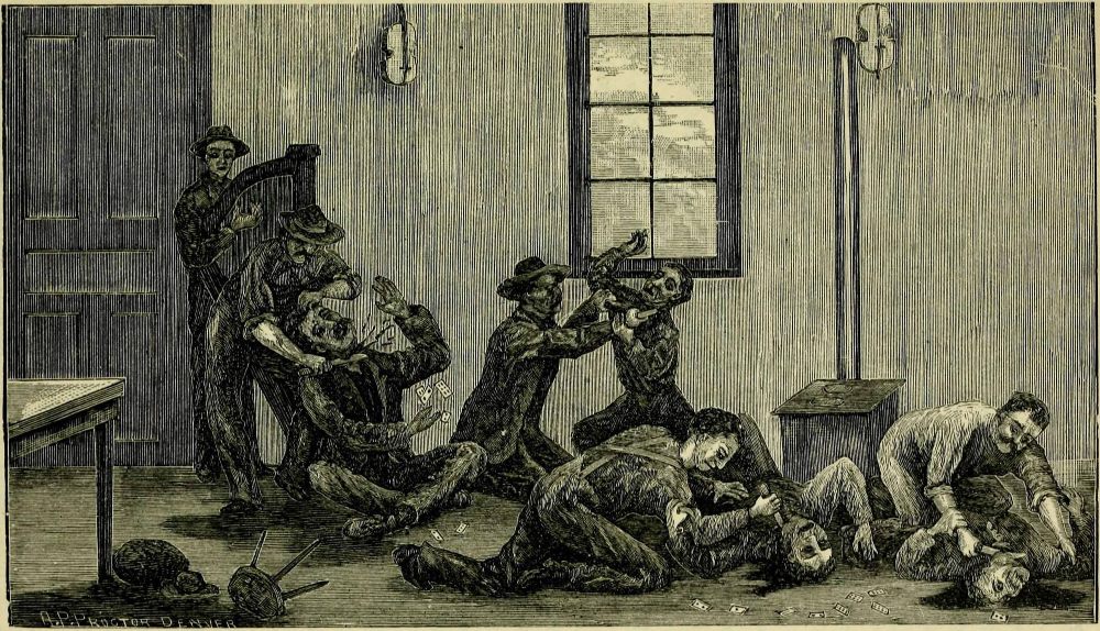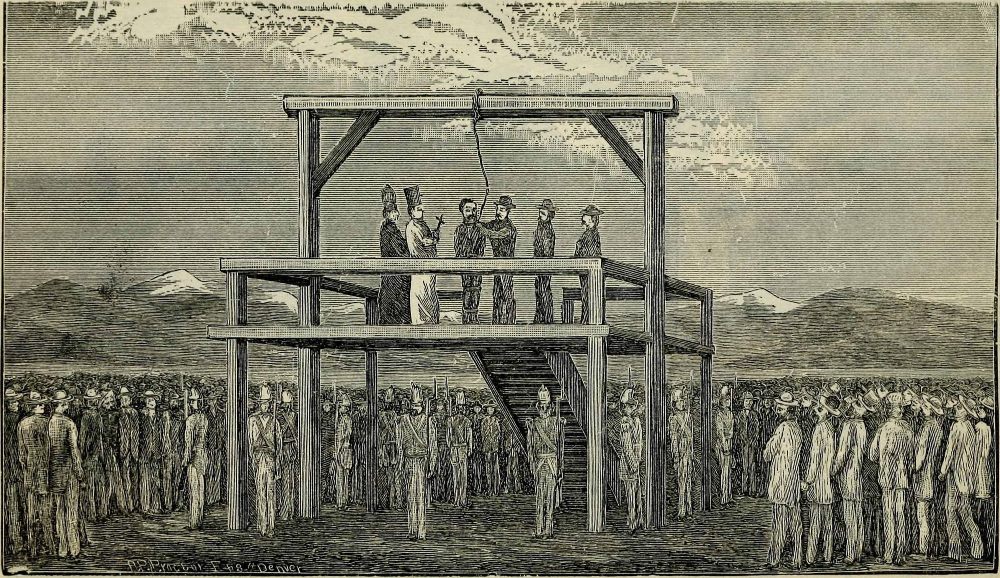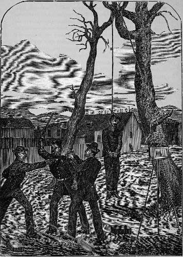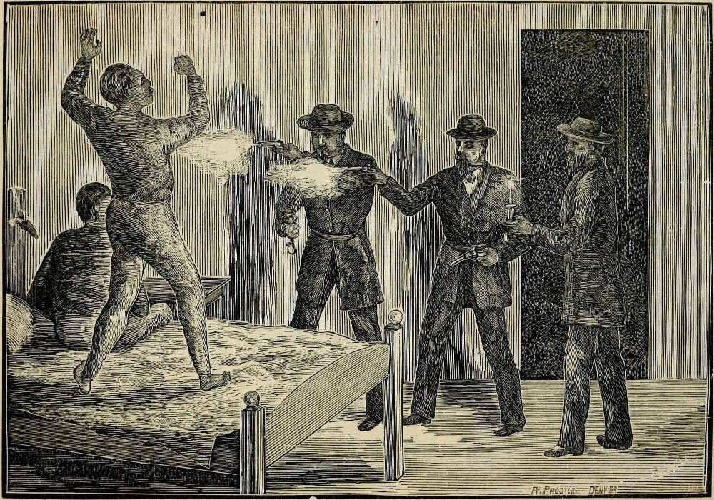 About the time of the arrival of the train, men and boys could be seen wending their way towards the Larimer and Fifteenth street crossings, and also to the depot, as rumor had named each place for the transfer of the prisoners to carriages. The largest crowd collected at the depot, where the train did unload its burden. It is said that there were those in the crowd who openly carried ropes for halters.