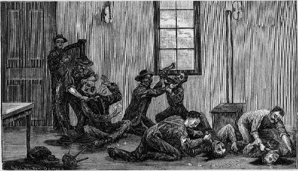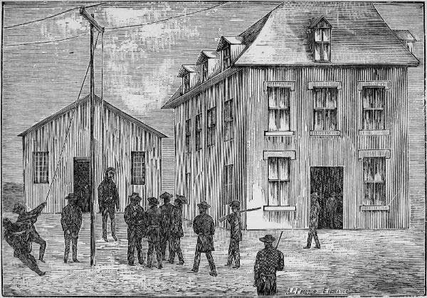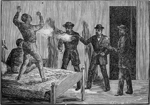 Previous to being put in a cell, the shackles, which were riveted to their ankles, were cut off, and then the men were placed in confinement.
