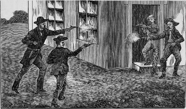 But the precious pair paid no heed to this warning, and went on as rapidly as their weary nags could carry them. Two more shots were sent after them.