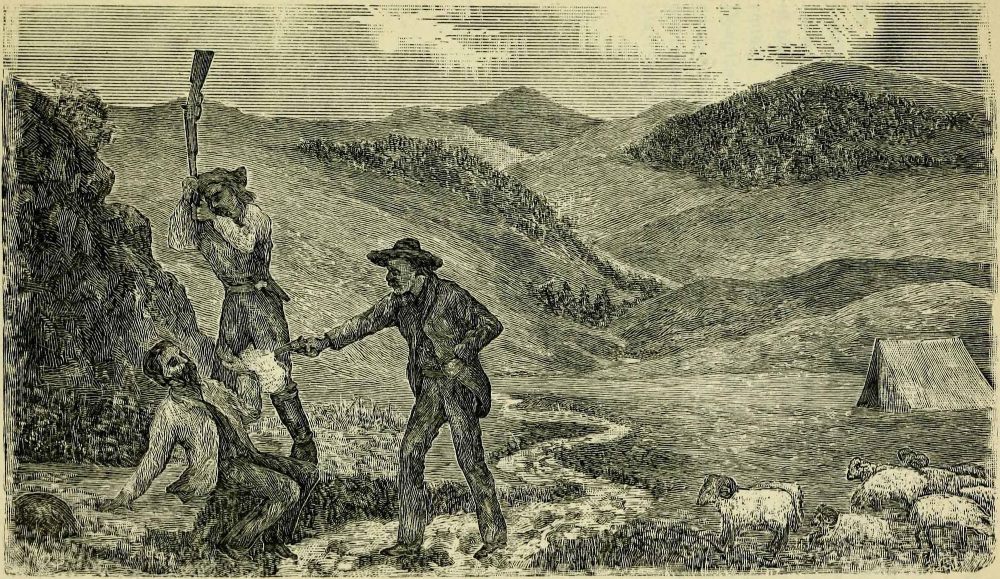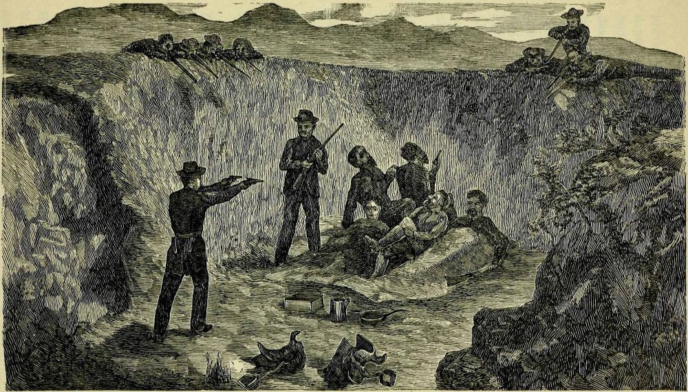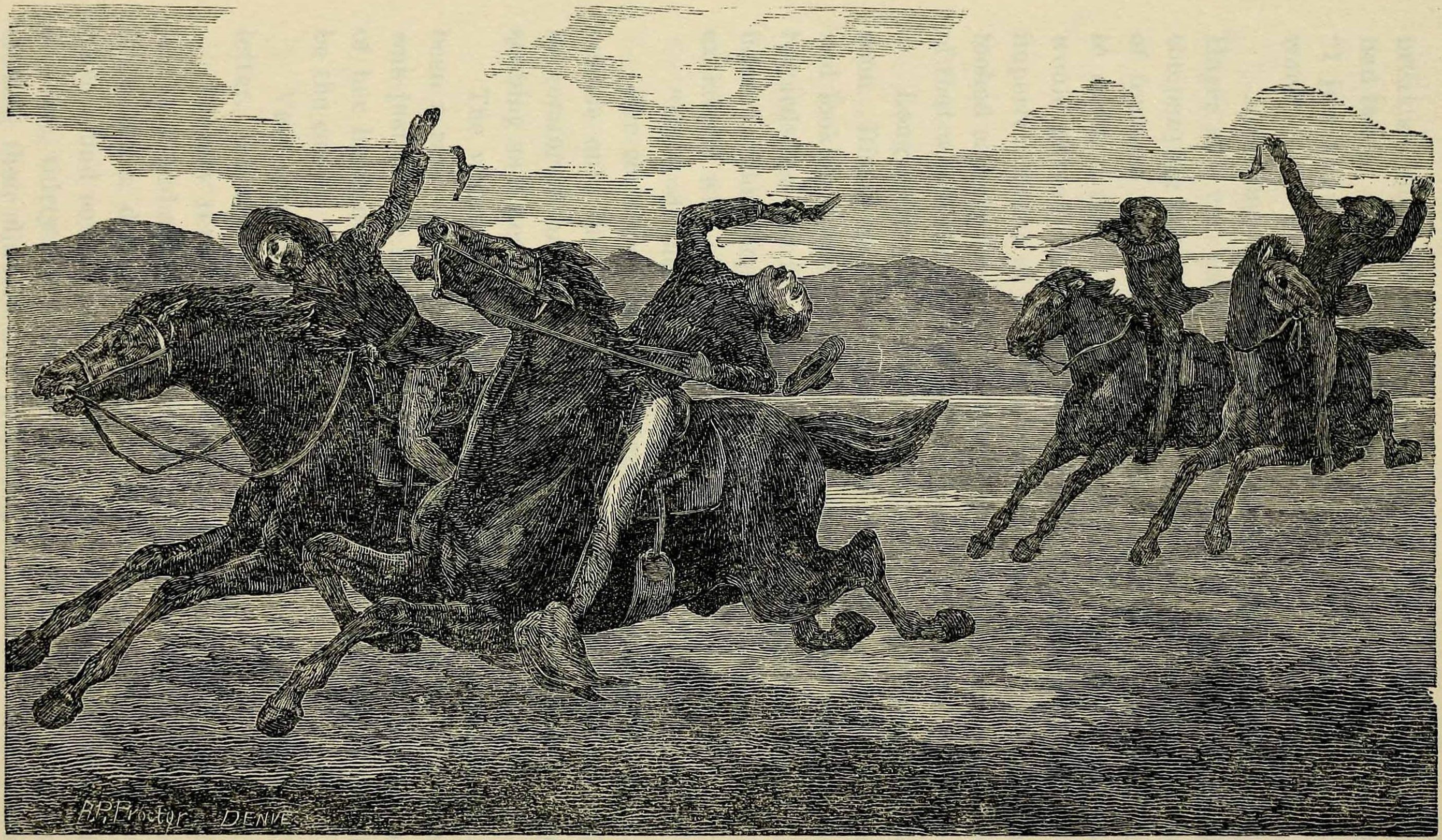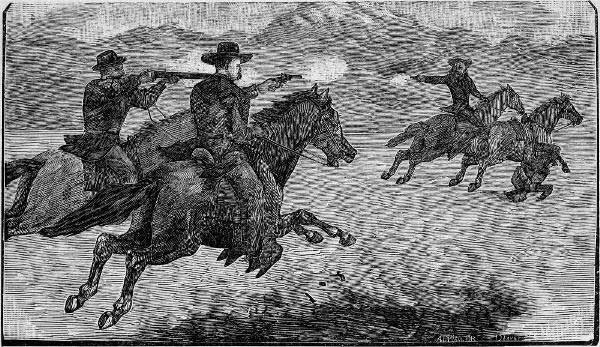 The long and hard chase seemed about to be finished, as it was almost certain that Cook, being a dead shot, would either kill or seriously wound both of his men. His bead is perfect. The finger goes to the trigger; there is a quick, nervous pull—down goes the hammer and—“clack” goes the gun. It is a misfire, and the two men ride triumphantly on into the plains.