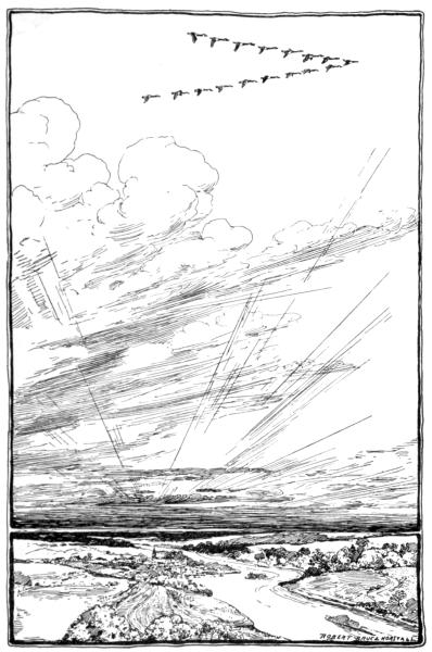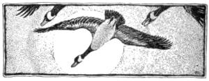 Let the chapter be read aloud by one pupil, with as much feeling as possible to the paragraph beginning, “I love the sound of the surf,” etc.; for this part is story, action, movement. Do not try to teach anything in this half. Let some other thoughtful pupil read the next section as far as, “Honk, honk, honk,” beginning the third paragraph from the end. This contains the lesson, the moral, and if you stop anywhere to talk about bird-protection, do it here. Let a third pupil read the rest of the chapter. Better than a moral lesson directly taught (and such lessons are much like doses of castor oil) will be the touching of the child’s imagination by the picture of the long night-flight high up in the clouds. Read them “To a Water Fowl,” by Bryant; and also some good account of migration like that by D. Lange (“The Great Tidal Waves of Bird-Life”) in the Atlantic[Pg 126] Monthly for August, 1909. Read to them Audubon’s account of the wild goose, in his “Birds.”