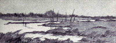 We have had a series of long, heavy rains, and water is standing over the swampy meadow. It is a dreary stretch, this wet, sedgy land in the cold twilight, drearier than any part of the woods or the upland pastures. They are empty, but the meadow is flat and wet, naked and all unsheltered. And a November night is falling.