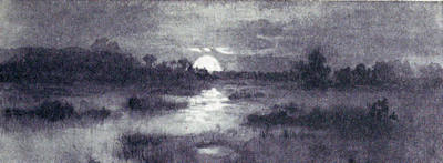 The darkness deepens. A raw wind is rising. At nine o’clock the moon swings round and full to the crest of the ridge, and pours softly over. I button the heavy ulster close, and in my rubber boots go down to the river and follow it out to the middle of the meadow, where it meets the main ditch at the sharp turn toward the swamp. Here at the bend, behind a clump of black alders, I sit quietly down and wait.