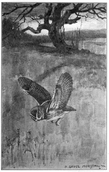 If, as the dusk comes down, I cannot go over to the tree, I will go to my window and watch. I cannot see him, the grim-beaked baron with his hooked talons, his ghostly wings, his night-seeing eyes, but I know that he has come to his window in the apple-tree turret yonder against the darkening sky, and that he watches with me. I cannot see him swoop downward over the ditches, nor see him quarter the meadow, beating, dangling, dropping between the flattened tussocks; nor can I hear him, as, back on the silent shadows, he slants upward again to his tower. Mine are human eyes, human ears. Even the quick-eared meadow mouse did not hear until the long talons closed and it was too late.