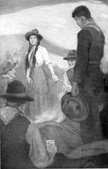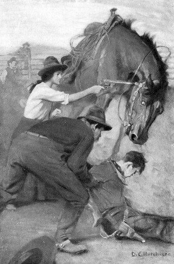 She looked down at him, her eyes blazing with anger; and then, snapping the empty cartridges out of the Colt's, she handed it back to a puncher.