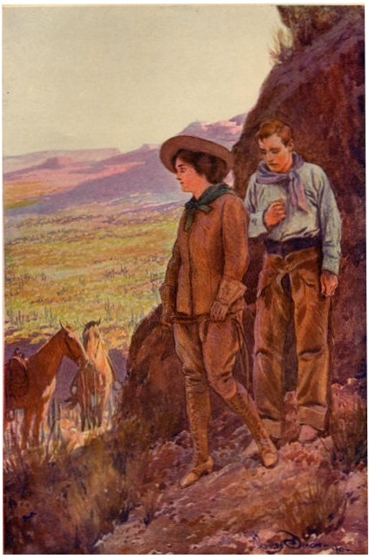 They were sitting close together beneath the ramada, looking out upon the sunlit valley and talking dreamily of the old days, when suddenly Hardy edged away and pointed apologetically to the western trail. There in single file came Judge Ware in his linen duster, a stranger in khaki, and a woman, riding astride.