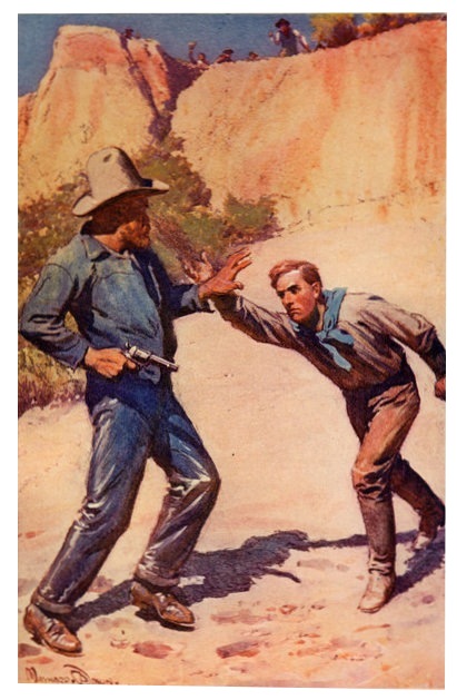 “Say,” he began, moderating his voice to a more conciliatory key, “I’ll tell you what I’ll do. There’s no use shooting each other over this. Send down your best man––if he licks me I go around; if I lick him I come across. Is it a go?”