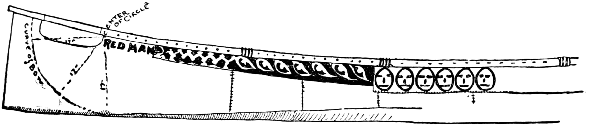The ribs are each the same length as the end-board. A and A´ of Fig. 219, are nailed in place in the same manner. Each[172] bottom-rib must have a notch 2 inches deep cut in the bottom edge to allow the free passage of water, so as to enable you to pump dry. Commencing at the stern, the distance between the inside of the bumper and the first rib is 1 foot 6 inches. This is a deck-rib, as may be seen by reference to Figs. 221 and 222. After measuring 1½ foot from the bumper, on inside of side-board, mark the point with a carpenter's pencil. Measure the same distance on the centrepiece, and mark the point as before; then carefully fit your rib in flush or even with the top of the side-piece, and fasten it in place by nails driven through the side-board into the end of the rib, and toe-nailed to centrepiece. Do the same with its mate on the other side of centrepiece.