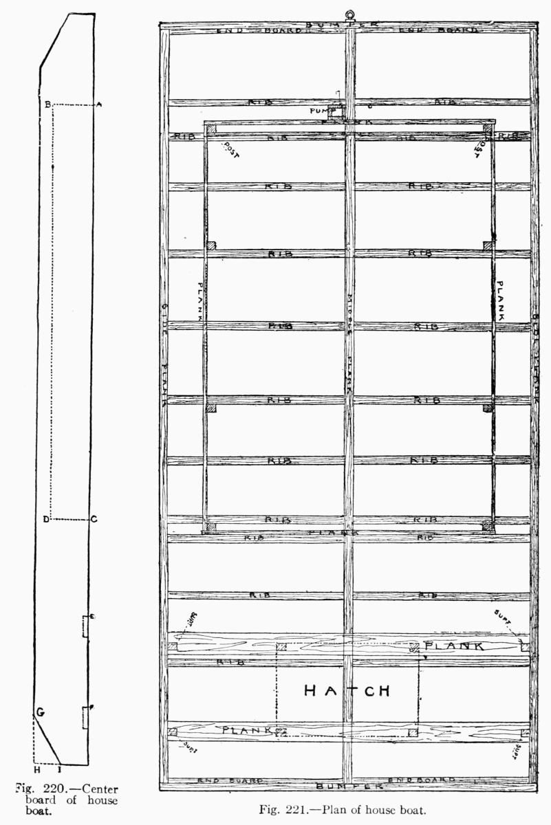 The description, so far, has been for a neatly finished craft, but I have seen very serviceable and comfortable house-boats built of rough lumber, in which case the curved roof, when they had one, had narrow strips nailed over the boards where they joined each other or was covered with tar-paper.