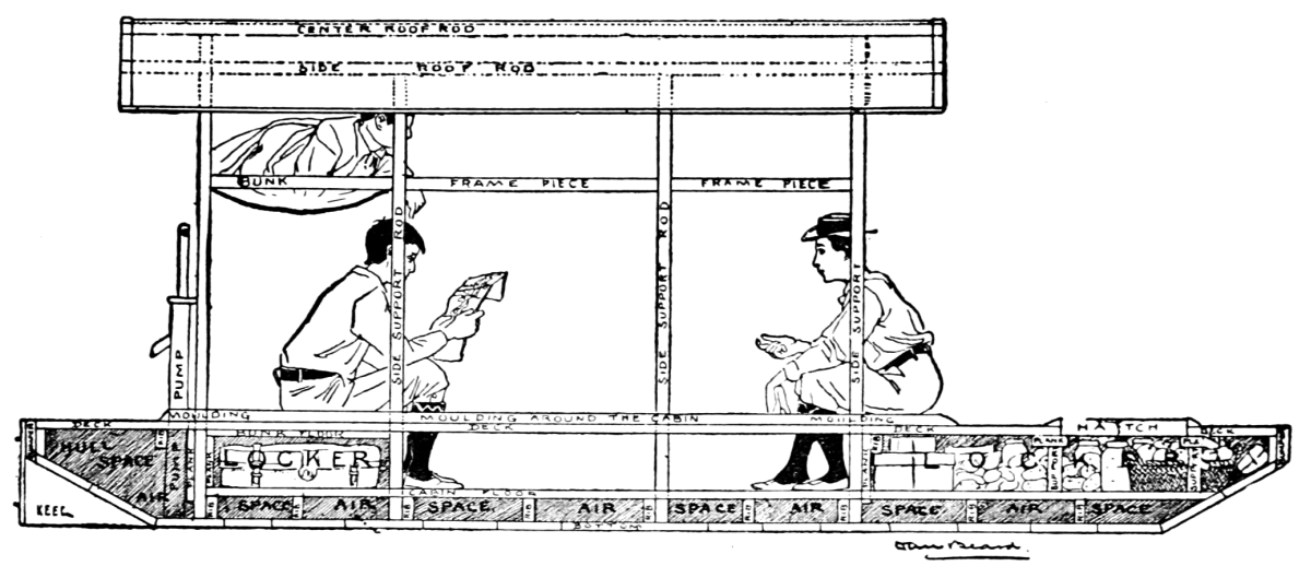 The top bunk is made like the frame of a cheap cot, but in place of being upholstered it has a strong piece of canvas stretched across it. This bunk is also hinged to the back of the cabin, so that when not in use it can be swung up against the roof and fastened there as the top berth in a sleeping-car is fastened. Four 4 by 4 posts can be bolted to the side-support at each corner of the bottom bunk; they will amply support the top bunk, as the legs do a table-top when the frame is allowed to rest upon their upper ends. This makes accommodation for two boys, and there is still room for upper and lower side bunks, the cabin being but six feet wide. If you put bunks on both sides you will be rather crowded, it is true, but by allowing a 1-foot passage in the middle, you can have two side bunks and plenty of head room. This will accommodate four boys, and that is a full crew for a boat of this size.