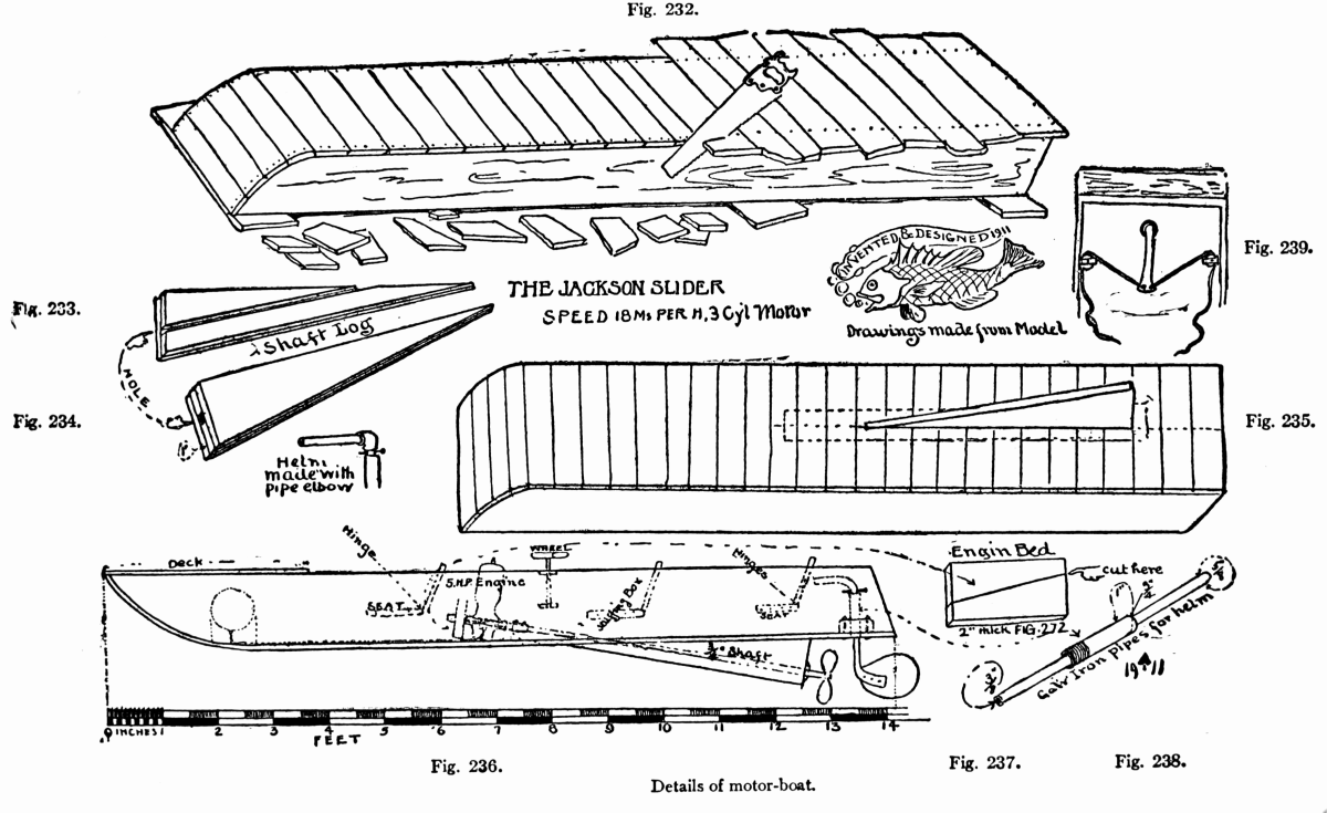 Many of them are the author's own inventions, and the others are his own adaptations of well-known and long-tried models. In writing and collecting this material for boat-builders from his other works and placing them in one volume, the author feels that he is fulfilling the wishes of many of his old readers and offering a[viii] useful book to a large audience of new recruits to the army of those who believe in the good old American doctrine of: "If you want a thing done, do it yourself." And by doing it yourself you not only add to your skill and resourcefulness, but, what is even more important, you develop your own self-reliance and manhood.