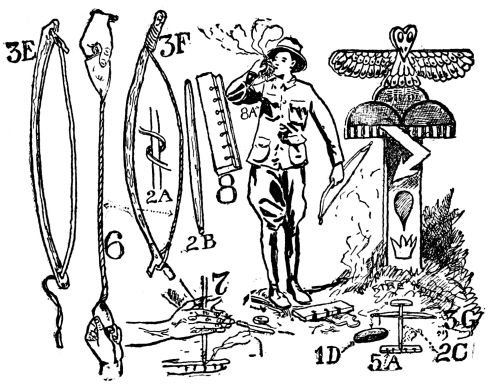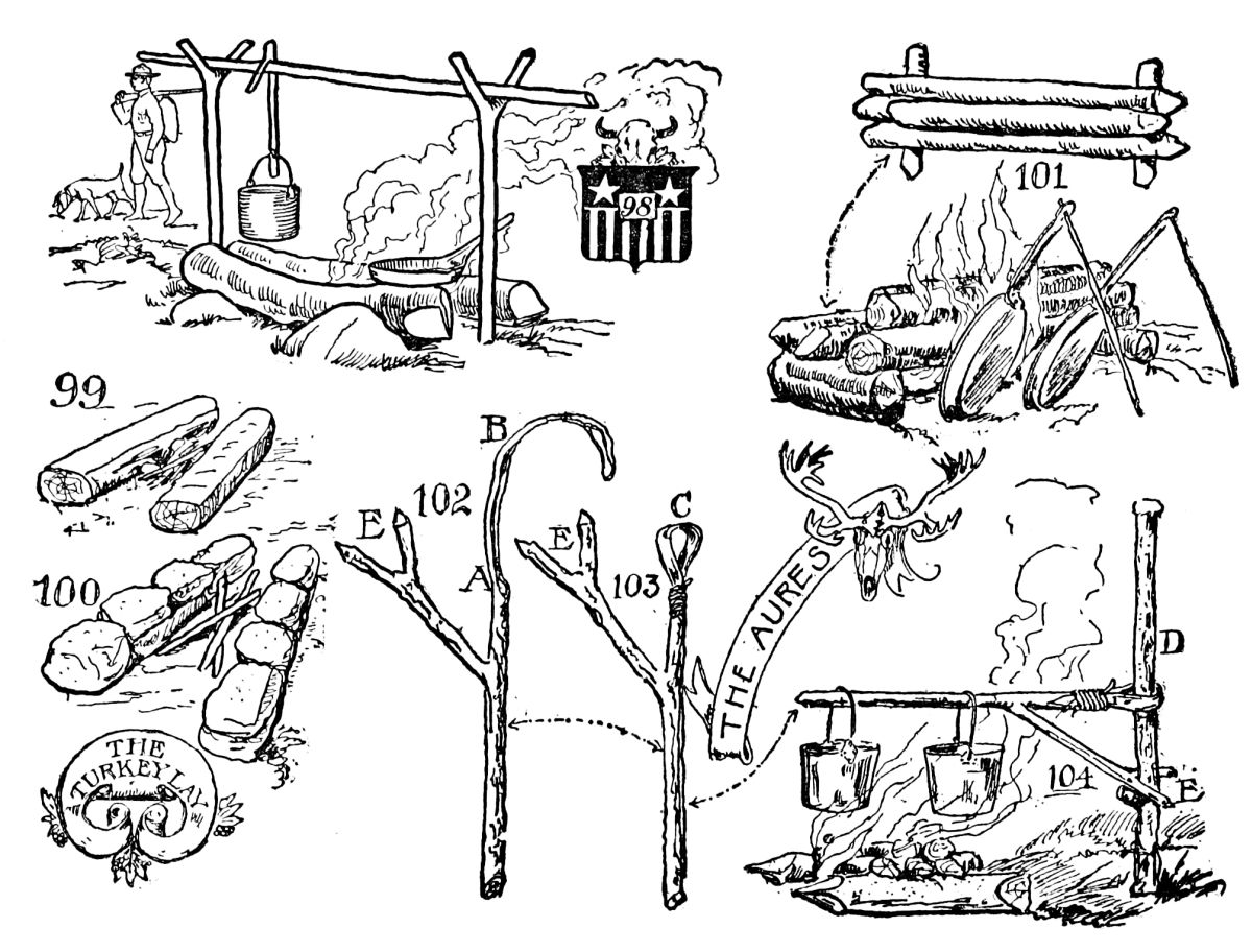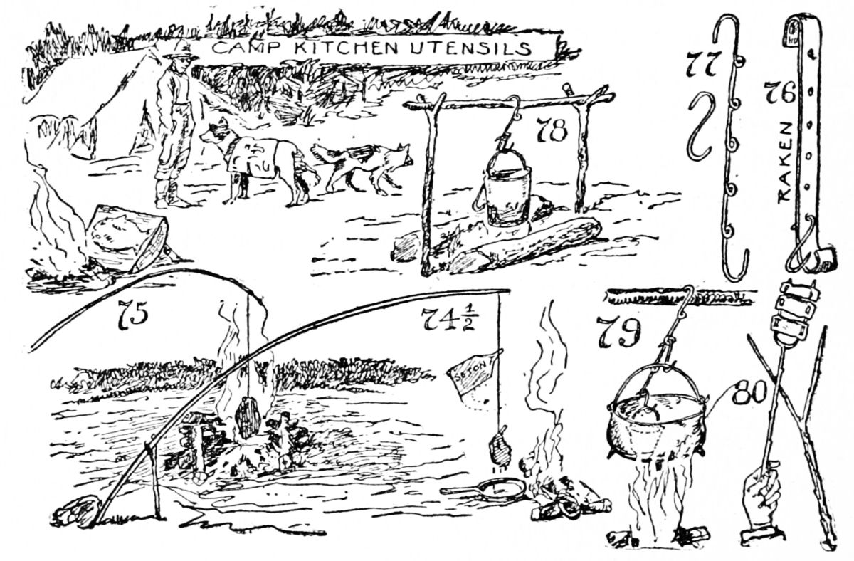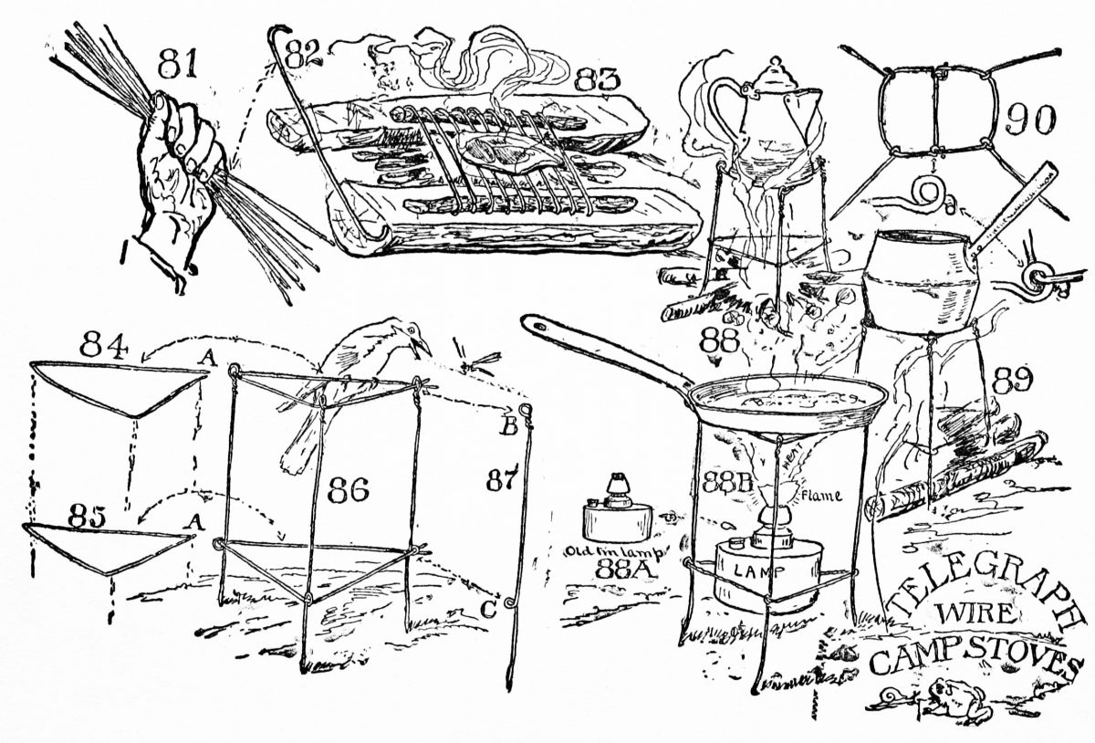A Personal Experience on Short Rations. The Most Primitive of Cooking Outfits. Camp Pot-hooks, the Gallow-crook, the Pot-claw, the Hake, the Gib, the Speygelia and the Saster. Telegraph Wire Cooking Implements, Wire Grid-iron, Skeleton Camp Stove. Cooking Fires, Fire-dogs, Roasting Fire-lay. Campfire Lay, Belmore Lay, Frying Fire Lay, Baking Fire Lay. The Aures Crane |