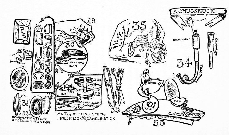 The White Man's Method, How to Use Flint and Steel. Where to Obtain the Flint and Steel. Chucknucks, Punk Boxes, Spunks and Matches. Real Lucifer Matches. Slow Match. How to Catch the Spark. Substitutes for Flint and Steel |