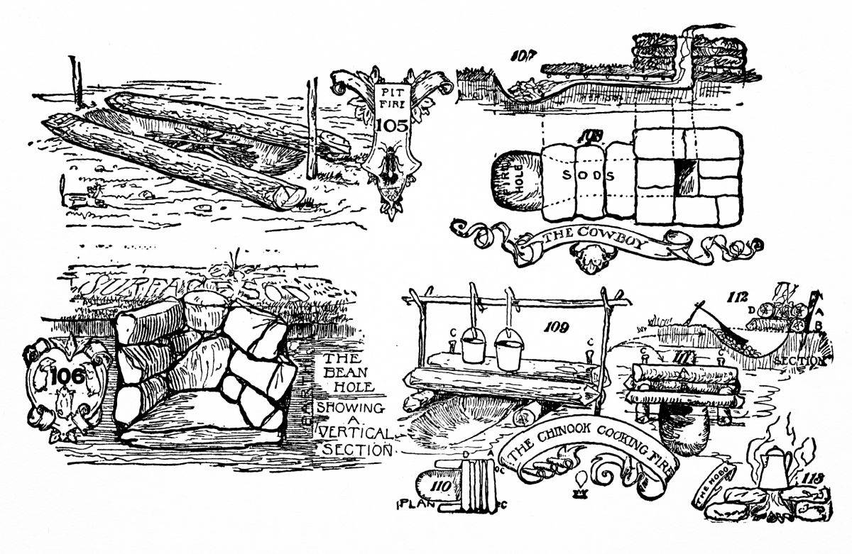 Camp Pit-fires, Bean Holes. Cowboy Fire-hole. Chinook Cooking Fire-hole. Barbecue-pits. The Gold Digger's Oven. The Ferguson Camp Stove. The Adobe Oven. The Altar Campfire Place. Camp Kitchen for Hikers, Scouts, Explorers, Surveyors and Hunters. How to Cook Meat, Fish and Bread Without Pots, Pans or Stoves. Dressing Small Animals. How to Barbecue Large Animals |