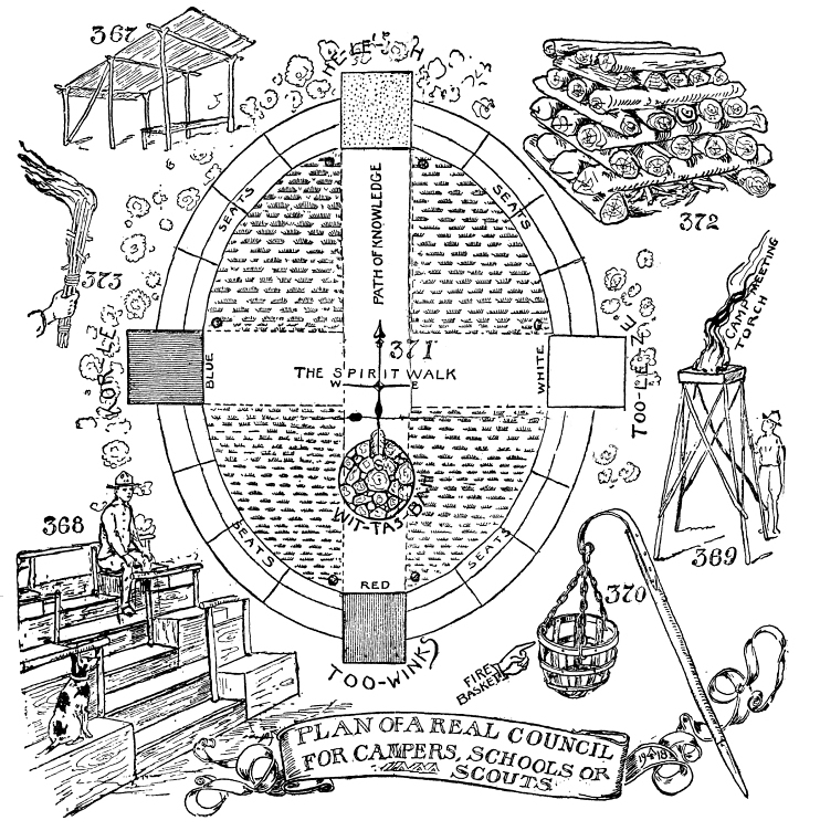 Cherokee Indian Council Barbecue. Camp Meeting Council Ground. The Indian Palisaded Council Fire. Indian Legends of the Fire. Stealing the Fire from the Sun-Maidens of the East. Myths of the Mewan Indians. Totems of the Four Winds, Four Mountains and Four Points of the Compass. Impractical Council Fires. Advantages of the Oval Council Ground. How to Make an Ellipse. How to Divide the Council Ground in Four Courts. Council Ceremonies. Ghost Walk and Path of Knowledge. What the Different Colors Stand for. Patriotism, Poetry and Americanism. Camp Meeting Torch Fires |