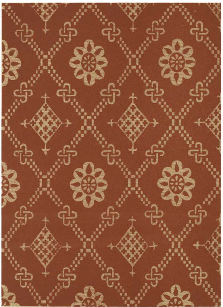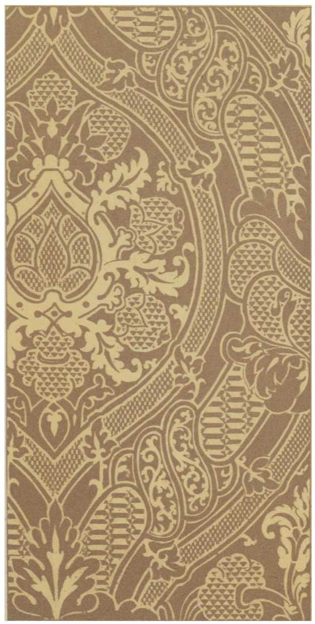 The materials out of which the articles in this collection were woven, are severally wool, hemp, flax, cotton, silk, gold, and silver. The silken textures are in general wholly so; in many instances they are wrought up along with either cotton, or with flax; hence, in ancient documents, the distinction of “holosericum,” all silk, and “subsericum,” not all silk, or the warp—that is, the longitudinal threads—of cotton or flax, and the woof—that is the cross-threads of silk. Very seldom is the gold or the gilt silver woven into these textiles found upon them in a solid wire-drawn form, but almost always, after being flattened very thin, the precious metal was wound about a very small twist of cotton, or of flax, and thus became what we call gold thread. As a substitute for this, the Moors of Granada, and after them the Spaniards of that kingdom, employed strips of gilded parchment, as we shall have to notice.