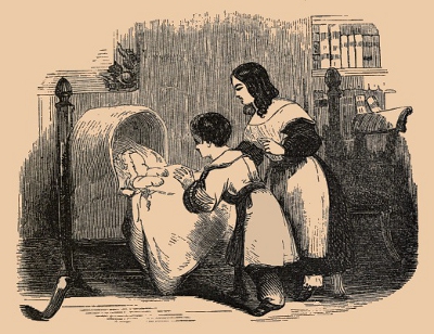 Minnie felt a little pang at her heart for the angry feeling which had tried to rise up against her mother. So she kissed her, and without saying a word took her cousin by the hand, and went into the bed room to look at her baby brother. Carefully stepping up to his little cot, she gazed upon his plump, happy face. His eyes were closed, and his lips moved, as if in his dreams he was talking with the angel watchers who guard an infant's bed. So Minnie [39]knew he was asleep, and returned with her report to her mother; after which she resumed her studies, feeling very glad because she had gained another victory over a little trial of patience and temper.