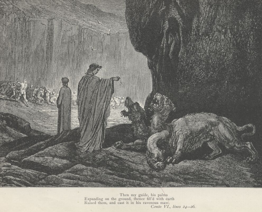 Of glutt'ny, damned vice, beneath this rain,