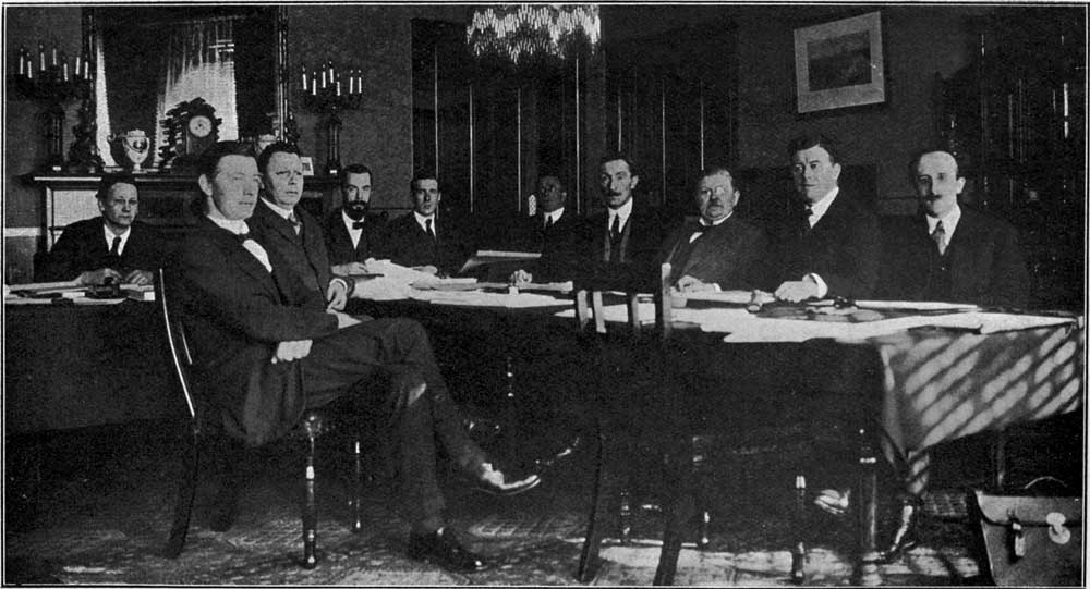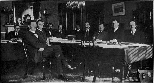 From left to right:—R. J. P. Mortished (Secretary), John O’Byrne, B.L.; C. J. France, Darrell Figgis (Acting Chairman), E. M. Stephens, B.L. (Secretary); P. A. O’Toole, B.L. (Secretary); James MacNeill, Hugh Kennedy, K.C.; James Murnahan, B.L.; James Douglas. (Prof. Alfred O’Rahilly and Kevin O’Shiel, B.L. were absent from the Session).