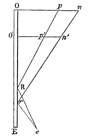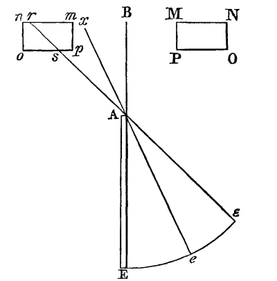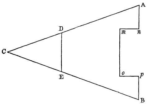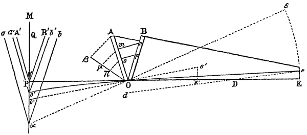 3. As the place of the eye in Bradley’s instrument is in front, and therefore much nearer the object, or sector, seen by direct vision, the angular magnitudes of all the different sectors are different, and hence they cannot unite into a symmetrical figure. This is so unavoidable a result of the erroneous position of the eye—a position too, rendered necessary from the absurd form of the mirrors—that Bradley actually employs his mirrors to convert a circle into an ellipse, and a square into a rectangle!