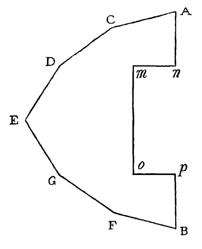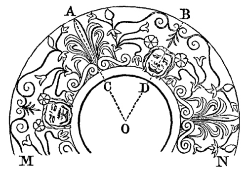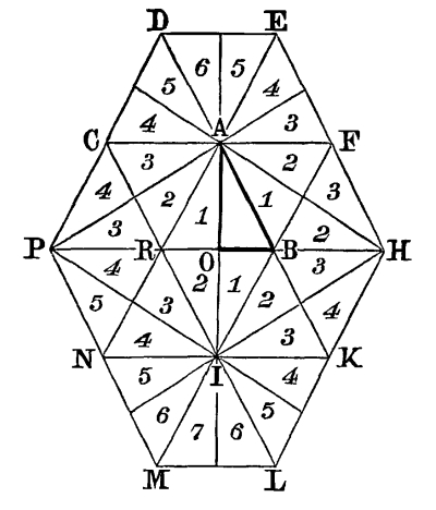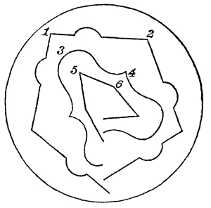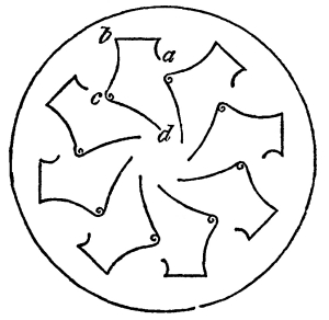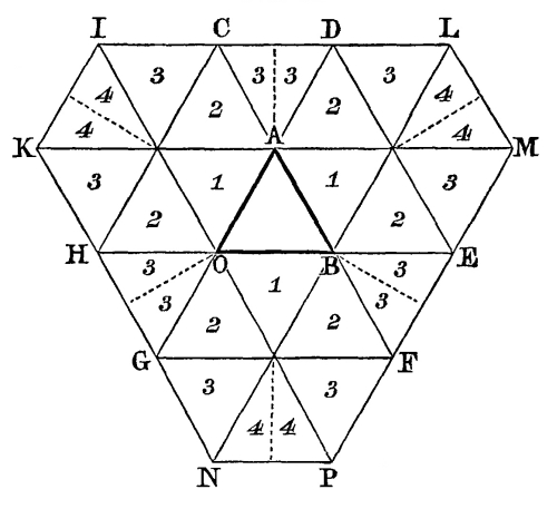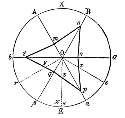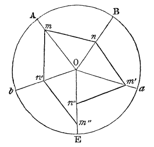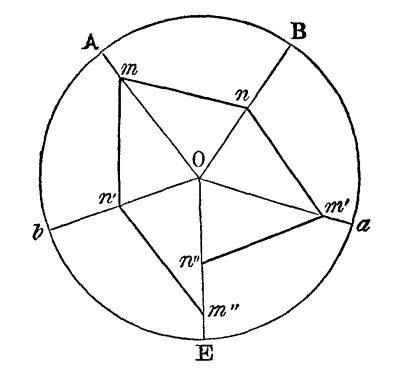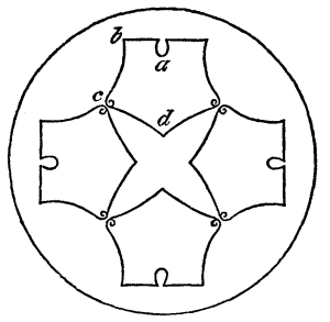1. Dr. Bradley, like Kircher, considers his mirrors as applicable to regular figures, such as are represented in Fig. 55, and was entirely unacquainted with the fact, that the inclination of the mirrors must be an even aliquot part of a circle. This is obvious, from his [Pg 179] stating that the mirrors may be set at the third, fourth, fifth, sixth, seventh, or eighth part of a circle; for if he had tried to set an irregular object between the mirrors when placed at the third, fifth, or seventh part of 360°, he would have found that a complete figure could not possibly be produced.