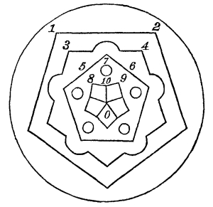 It must be quite obvious to any person who attends to Kircher’s description, that the idea never once occurred to him of producing beautiful and symmetrical forms by means of plane mirrors. His sole object was to multiply a given regular form a certain number of times; and he never imagined that, when the mirrors were placed at the angles marked with an asterisk, there could be no symmetry in the figure, and no union of the two last reflected images, unless in the case where a regular object was placed, either by design or by accident, in a position symmetrically related to both the reflectors.