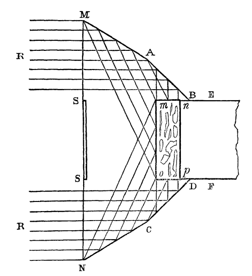 2. That out of an infinite number of positions for the object, both within and without the reflectors, there was only one where perfect symmetry could be obtained, namely, when the object was placed in contact with the ends of the reflectors. This was precisely the position of the cement in the preceding experiment with the triangular trough.
