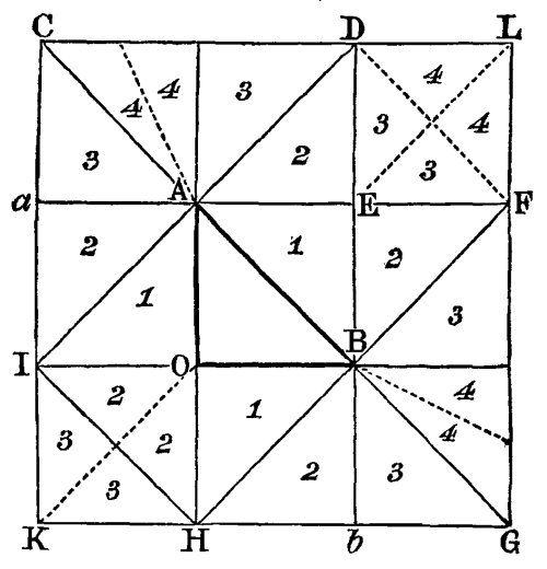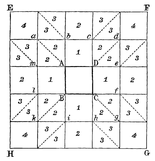 “Example I.—Turn the side A to any certain point, either to the north, or to the window of your room; and when you have opened your glasses to an exact square, set one of them on the line of the side D, and the other on the line of the side C, you will then have a square figure four times as big as the engraved design in the plate: but if that representation should not be agreeable, move the glasses (still open to a square) to the number 5 of the side D, so will one of them be parallel to D, and the other stand upon the line of the side C, your first design will then be varied; and so by moving your glasses, in like manner, from point to point, the [Pg 178] draughts will differ by every variation of the glasses, till you have discovered at least fifty plans, differing from one another.