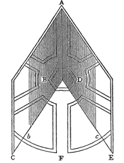 “Draw a large circle upon paper; divide it into three, four, five, six, seven, or eight equal parts; which being done, we may draw in every one of the divisions a figure, at our pleasure, either for garden-plats or fortifications; as, for example, in Fig. 55, we see a circle divided into six parts, and upon the division marked F is drawn part of a design for a garden. Now, to see that design entire, which is yet confused, we must place our glasses upon the paper, and open them to the sixth part of the circle, i.e., one of them must stand upon the line b, to the centre, and the other must be opened exactly [Pg 176] to the point c; so shall we discover an entire garden-plot in a circular form (if we look into the glasses), divided into six parts, with as many walks leading to the centre, where we shall find a basin of an hexagonal figure.