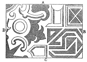 “Example II.—Turn the side marked B, of Fig. 56, to the same point where A was before, and by moving your glasses as you did in the former example, you will discover as great a variety of designs as had been observed in the foregoing experiment; then turn the side C to the place of B, and, managing the glasses in the manner I have directed in the first example, you may have a great variety of different plans, which were not in the former trials; and the fourth side, D, must be managed in the same manner with the others; so that from one plan alone, not exceeding the bigness of a man’s hand, we may vary the figure at least two hundred times; and so, consequently, from five figures of the like nature, we might show about a thousand several sorts of garden-plats; and if it should happen that the reader has any number of plans for parterres or wilderness-works by him, he may, by this method, alter them at his pleasure, and produce such innumerable varieties, that it is not possible the most able designer could ever have contrived.”